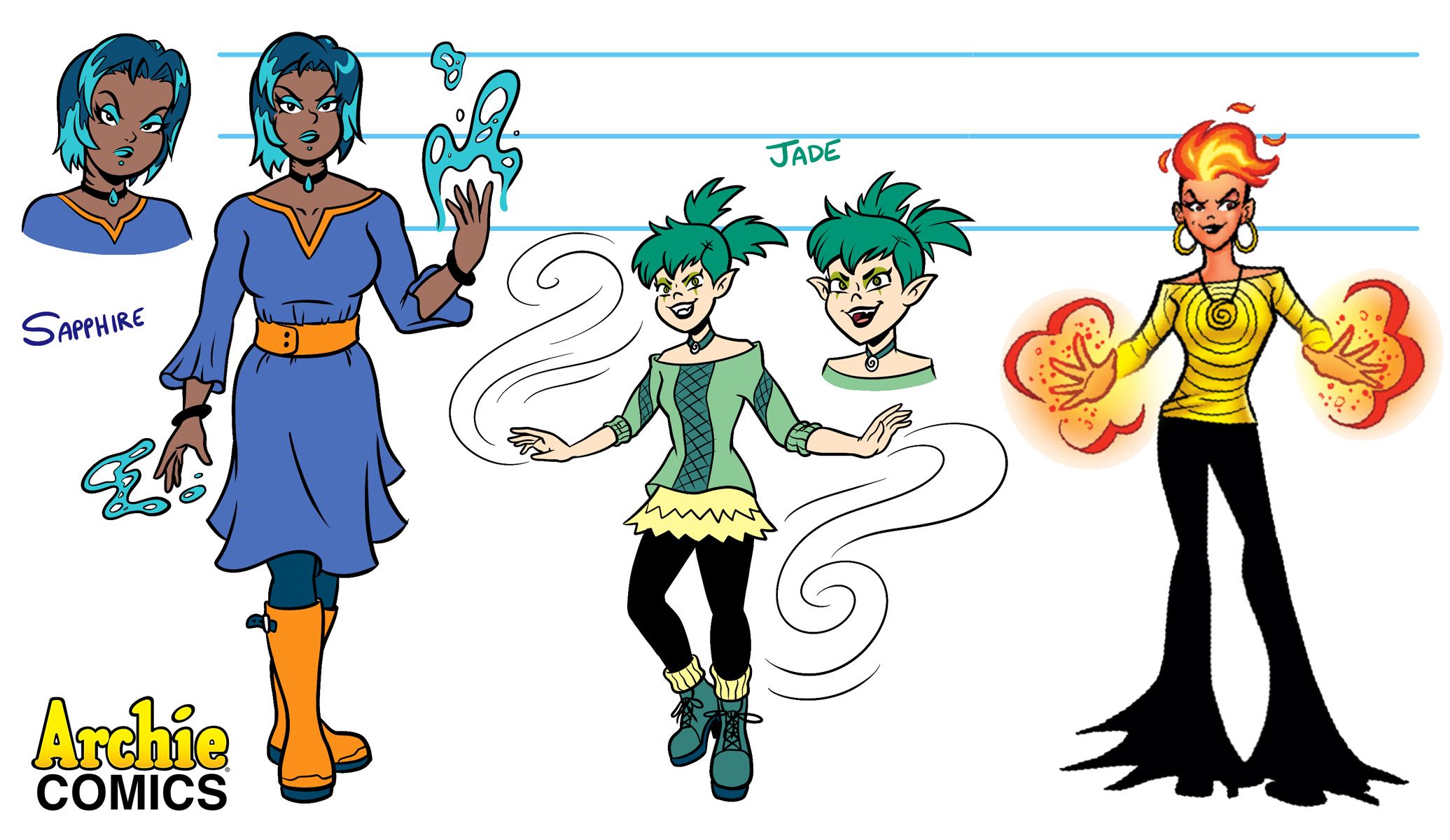 As Pellerito hinted, the two new witches wield power in much different ways than previously seen in the Sabrina side of the Archie Universe. Jade, a small-but-fierce woodland fairy who generates her power from the wind, is an agent of chaos, and is often the wildcard of any operation. The calm and collected Sapphire, by contrast, comes from a family of sea-witches, with the ability to conjure water and communicate with sea life.