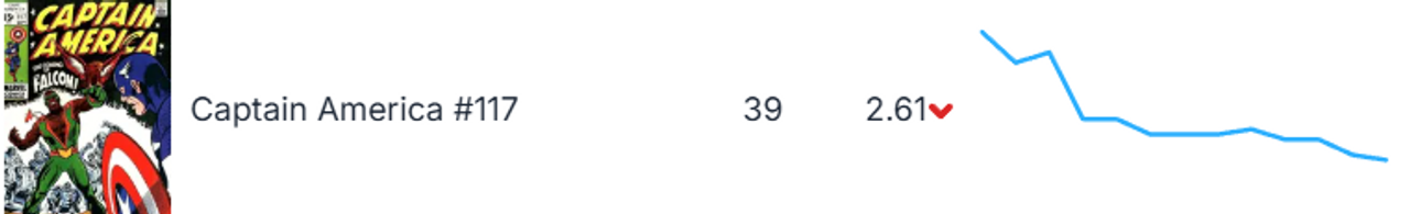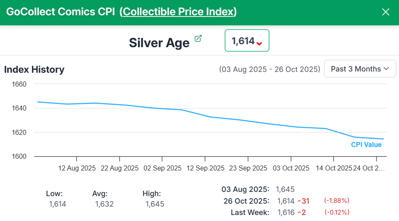 The Silver Age CPI was down 1.88% compared to three months ago. While not great, it’s certainly better than the 2.55% loss in the previous 90-day time period. Overall, 40 books were down, nine were up, and one was flat.