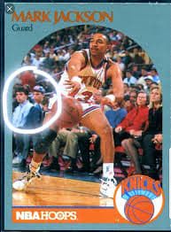 I save my favorite example of these kinds of cards for last, though. It’s the best because of its nefarious nature. The card is from 1990 and it features the New York Knicks’ Marc Jackson. To glance at it you may think it is an ordinary card, just a player driving up the court with the crowd in the background. But it is what lurks in that background that makes this card so chilling.
