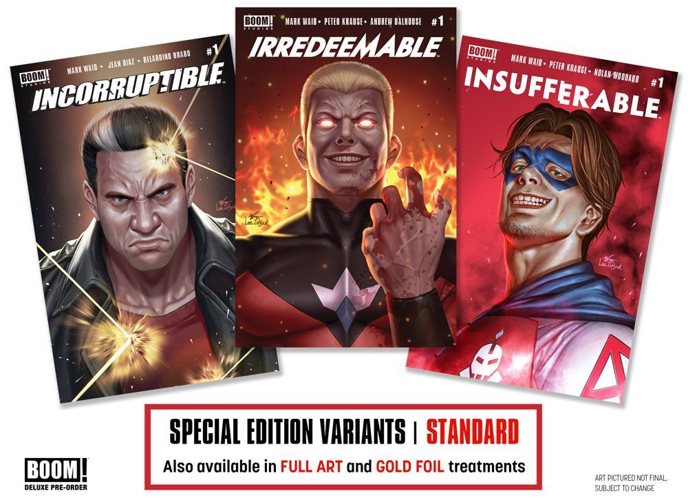 Opening for pre-orders today on Kickstarter, THE COMPLETE IRREDEEMABLE DELUXE EDITION LIBRARY collects each series in the IRREDEEMABLE saga in a comprehensive, deluxe hardcover format, alongside highly limited, special-edition printings of each series' long sold-out #1 issues – IRREDEEMABLE #1, INCORRUPTIBLE #1, and INSUFFERABLE #1 – each featuring all-new artwork by superstar cover artist InHyuk Lee (Amazing Spider-Man) in three distinct, collectible treatments.