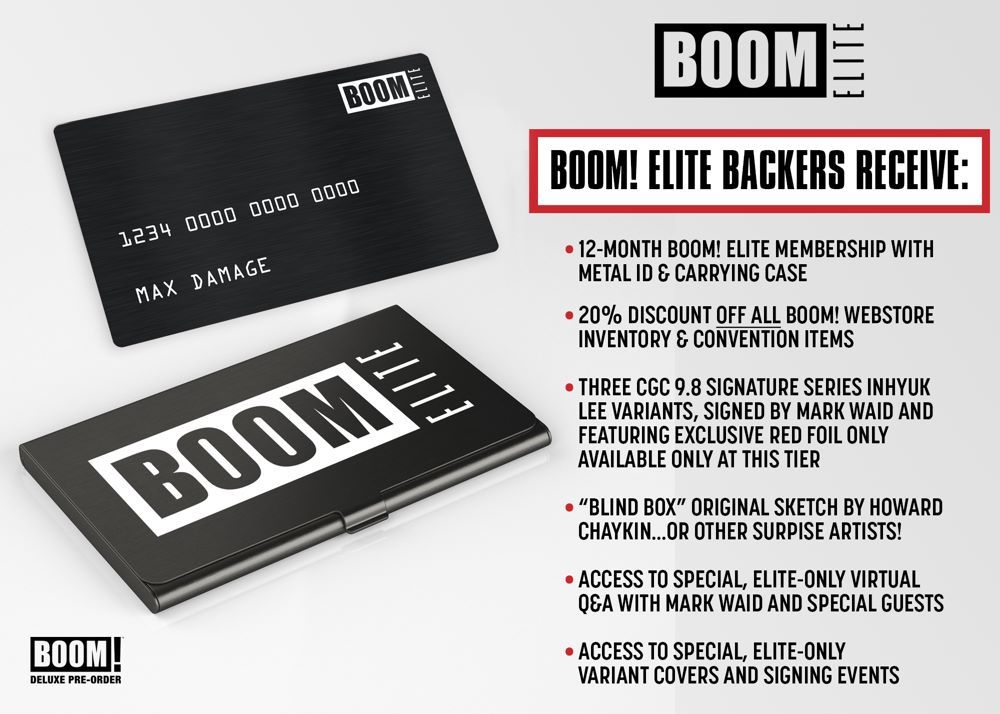 Plus: All backers at the ELITE tier will become inaugural inductees into the first class of BOOM! ELITE membership holders. In tandem with a 12-month BOOM! ELITE membership available only at the highest tier, backers will receive an exclusive metal ID card and carrying case, which can be used to redeem 20% off all BOOM! webstore inventory and convention items with no annual limit and multiple other perks – including access to exclusive, ELITE-only variant covers, special signing opportunities, and access to an exclusive online Q&A with Mark Waid and special guests. It's a small club…because there can never be more than 100 BOOM! ELITE members at any one time!
