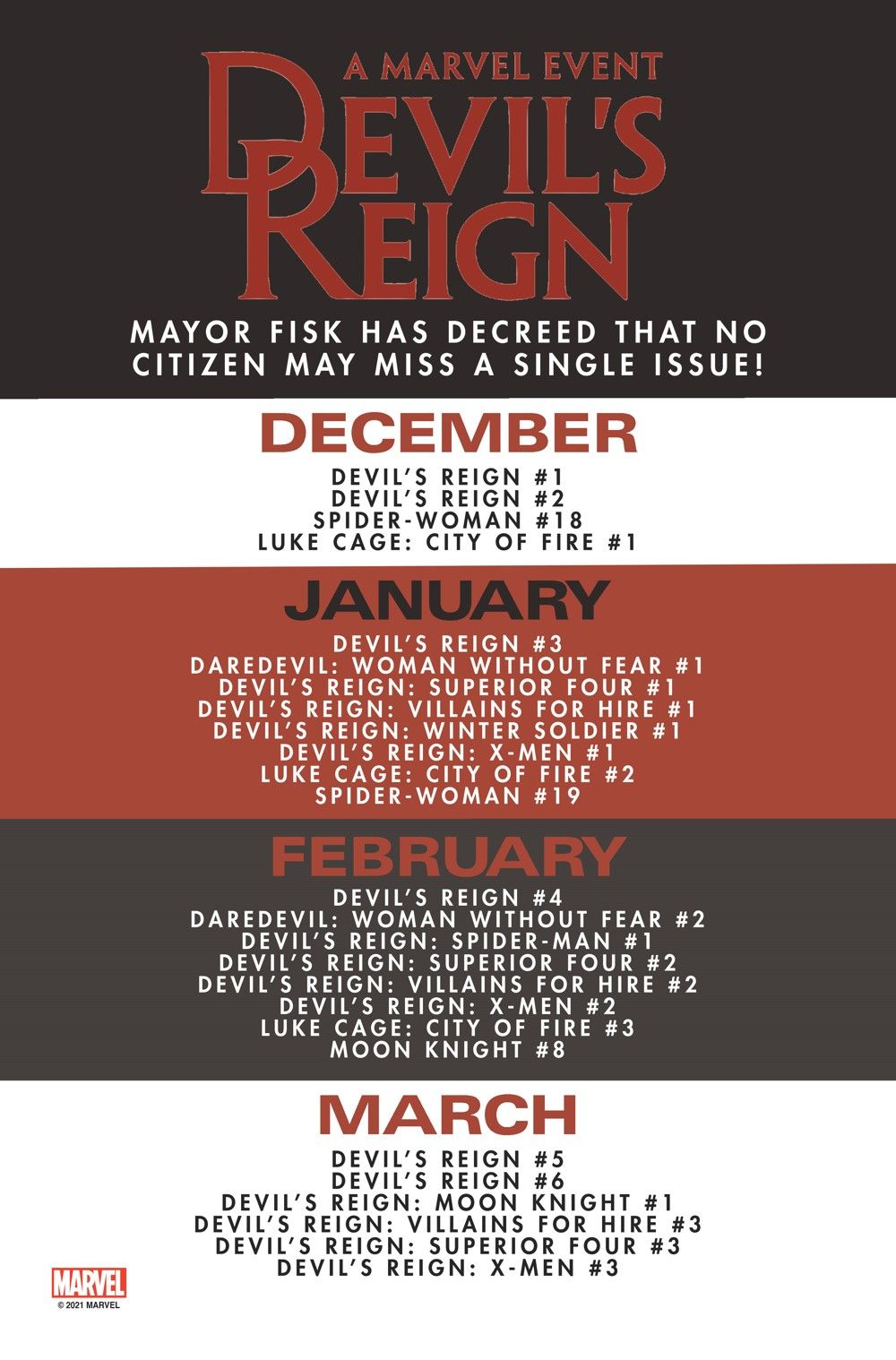 You can now check out a complete event checklist and see what 'Devil's Reign' will unleash on Marvel Comics this February.