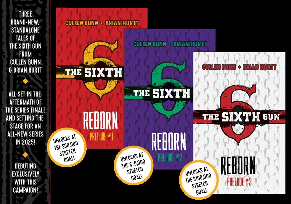 It all begins with THE SIXTH GUN DELUXE OMNIBUS LIBRARY – debuting today exclusively on Kickstarter with four, deluxe hardcover volumes collecting the totality of the bullet-riddled action epic that CBR calls "a modern comic book classic"...plus, over the course of this campaign, up to three ALL-NEW prelude one-shots setting the stage for Bunn and Hurtt's upcoming return to the world of THE SIXTH GUN in 2025, just in time for the series' 15th anniversary!
