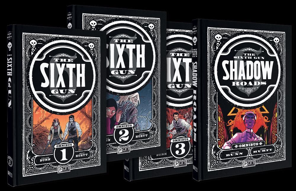 Featuring the entirety of the series' groundbreaking, 50-issue run from THE SIXTH GUN #1–50 – plus the companion THE SIXTH GUN: SONS OF THE GUN #1-5, THE SIXTH GUN: DAYS OF THE DEAD #1-5, THE SIXTH GUN: DUST TO DUST #1-3, and THE SIXTH GUN: VALLEY OF DEATH #1-3 series, alongside the standalone spin-off series, SHADOW ROADS #1-10 – across four hardcover volumes spanning more than 1,500 pages, THE SIXTH GUN DELUXE OMNIBUS LIBRARY is the ultimate opportunity to experience Bunn and Hurtt's occult odyssey through the Old West for long-time fans and first-time readers alike.