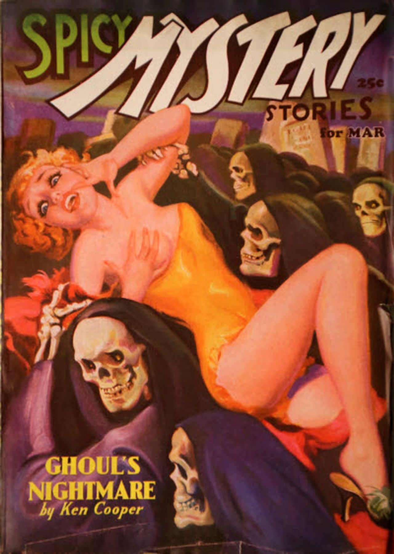 A number of spicy pulps published by Culture Publications sold in the February 20 Heritage auction for huge record-setting prices. The top seller was Spicy Mystery Stories #5, published in October 1935. A 6.5 graded copy sold for $22,800. It’s the highest grade in the CGC census and the first recorded sale of a graded copy. The issue’s cover was illustrated by Norman Saunders and features “good girl” bondage and a hypodermic needle.