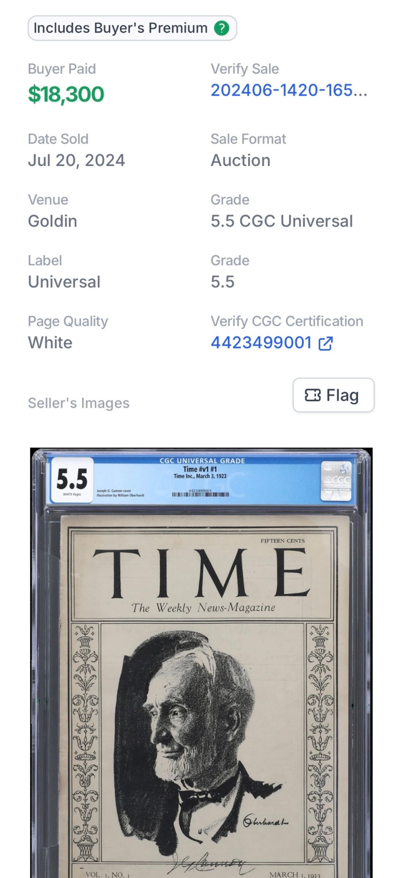 While the magazine is no longer the cultural touchstone it once was, vintage copies of Time have become sought after collectibles. The very first issue of Time, which featured the then-Speaker of the House, Joseph Gannon, and published in 1923, is extremely hard to find and rarely for sale. There are only seven universal blue label copies on the CGC Census and only one graded copy has ever sold at public auction. This near top-of-the-census CGC 5.5 copy of the first issue of Time sold for $18,300 at Goldin Auctions in July 2024: