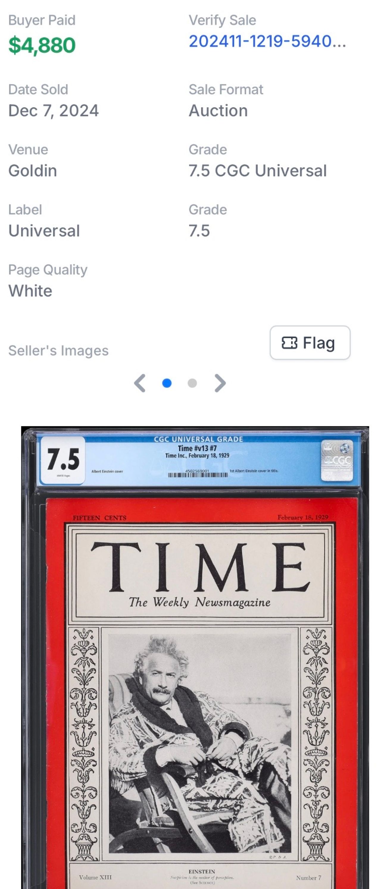 Other notable and valuable issues that sell for higher prices among collectors tend to be both rare and historically significant. For example, the first issue of Time featuring Albert Einstein on its cover is especially valuable. This CGC 7.5 copy of Time vol. #13, issue #7 (1929), which features Einstein on the cover for the first time, sold for $4,880 on eBay in December 2024: