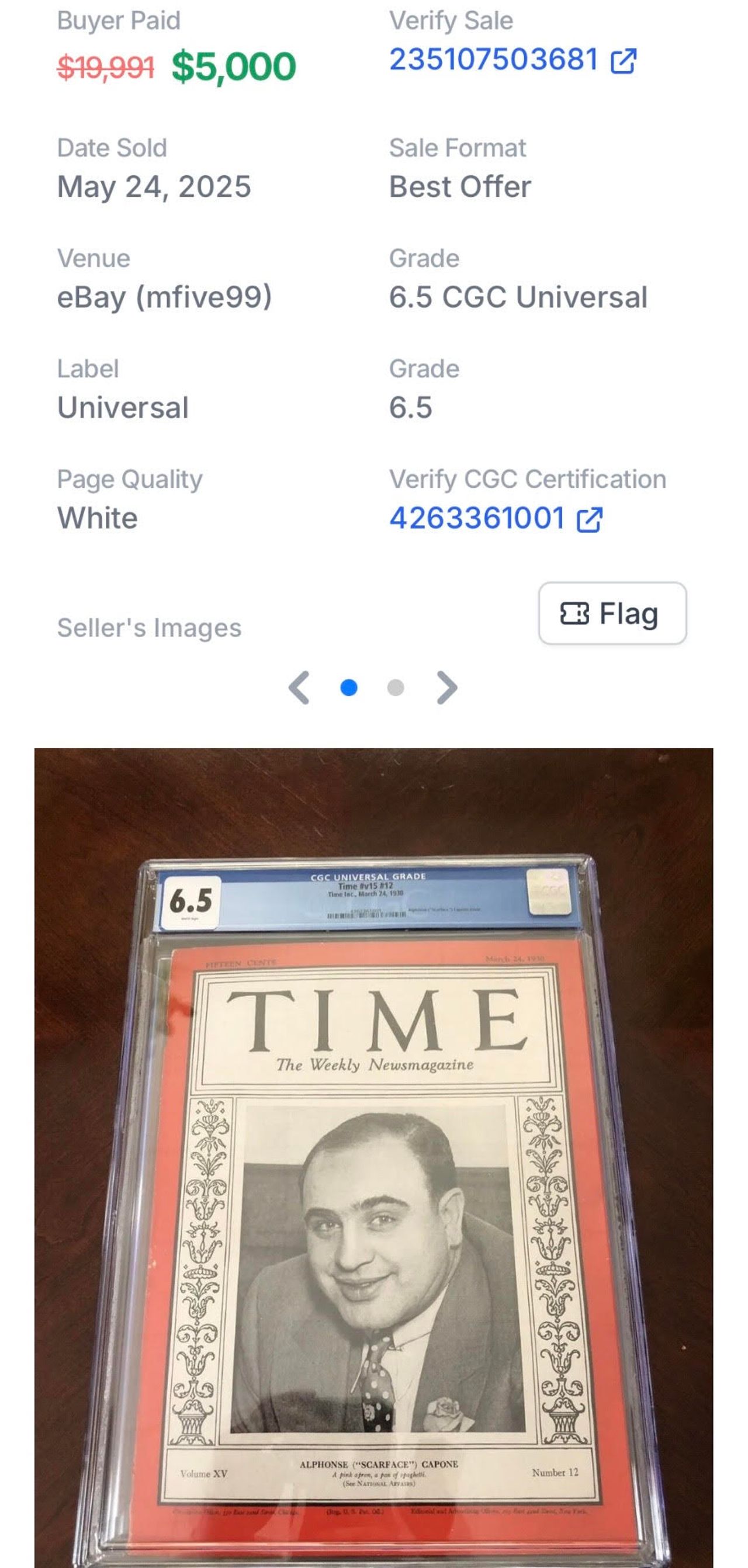 A year later, Time made the bold decision to feature a criminal for the first (but not the last) time on its cover: the Chicago crime boss, Al Capone. This 1930 issue with "Scarface" on its cover is popular among collectors with this CGC 6.5 copy selling for an impressive $5,000 Best Offer back in May 2025:
