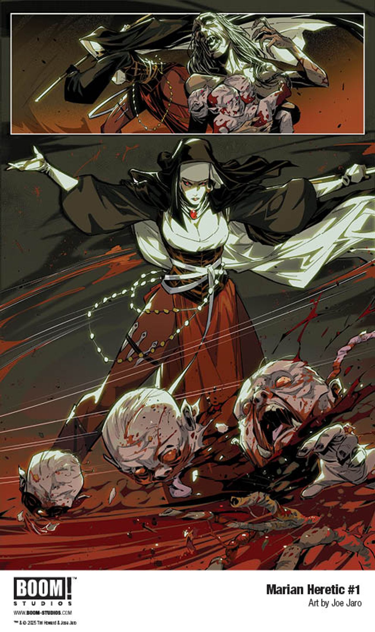 Media Release -- Acclaimed writer Tini Howard (Catwoman) and lauded artist Joe Jaro (Buffy the Last Vampire Slayer) launch their very first creator-owned series at BOOM! Studios with a provocative, high-octane new take on nunsploitation, religious horror, rebellion, and good ole fashioned monster hunting in MARIAN HERETIC, coming October 2025.