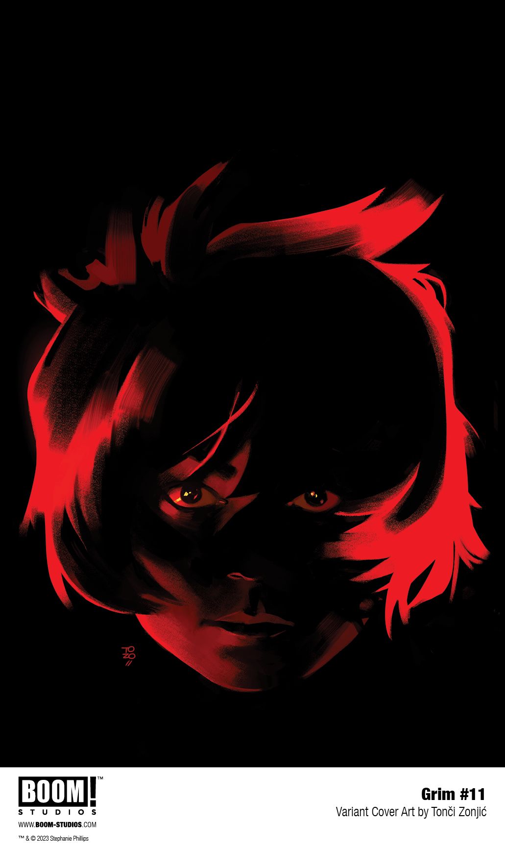 Media Release -- BOOM! Studios revealed today the variant cover of GRIM #11 by Tonci Zonjic (Skulldigger + Skeleton Boy), the first issue of a new story arc in the hit bestselling comic book series from acclaimed writer Stephanie Phillips (Harley Quinn, Wonder Woman), fan favorite artist Flaviano (New Mutants), colorist Rico Renzi (Spider-Gwen), and letterer Tom Napolitano (The Joker), as Jessica Harrow and her fellow Reapers face new gods, beasts, and dangers in the underworld and beyond.
