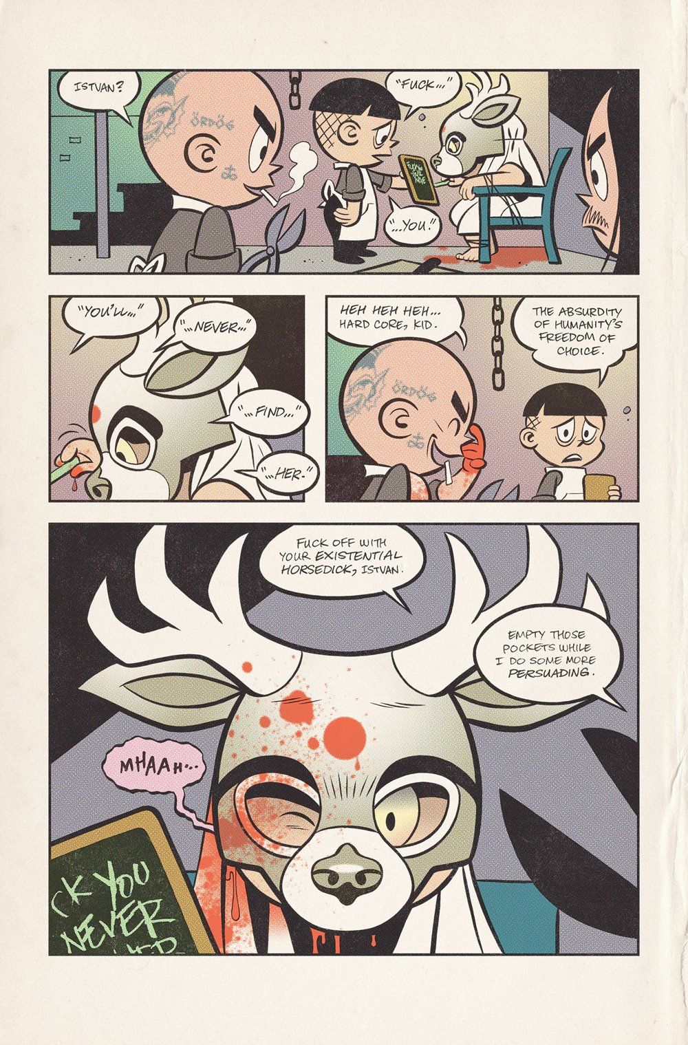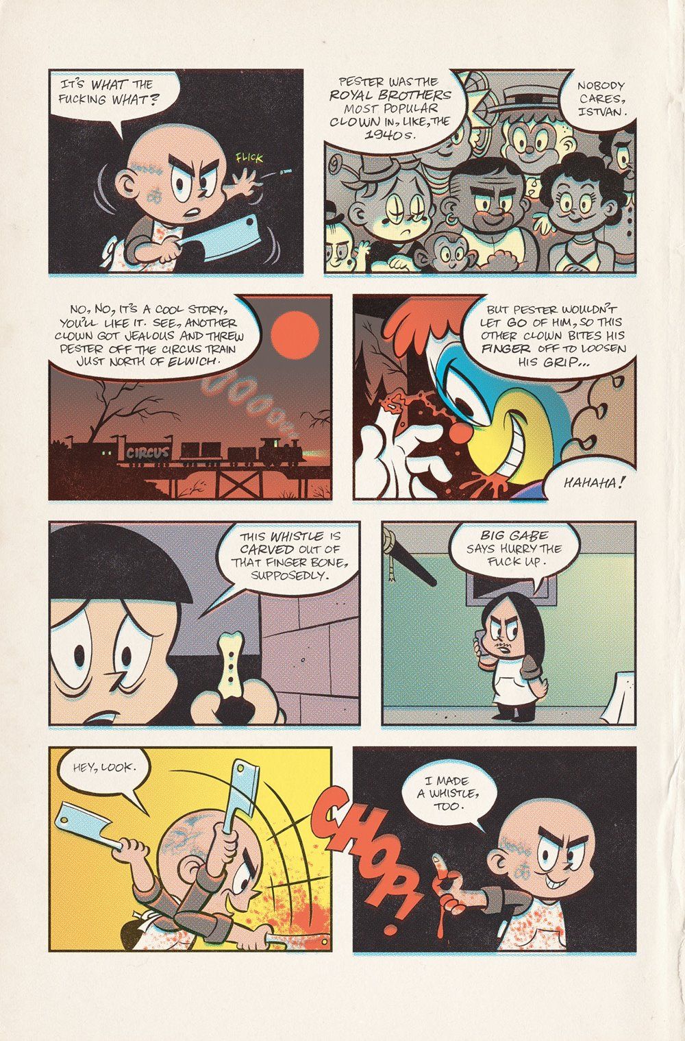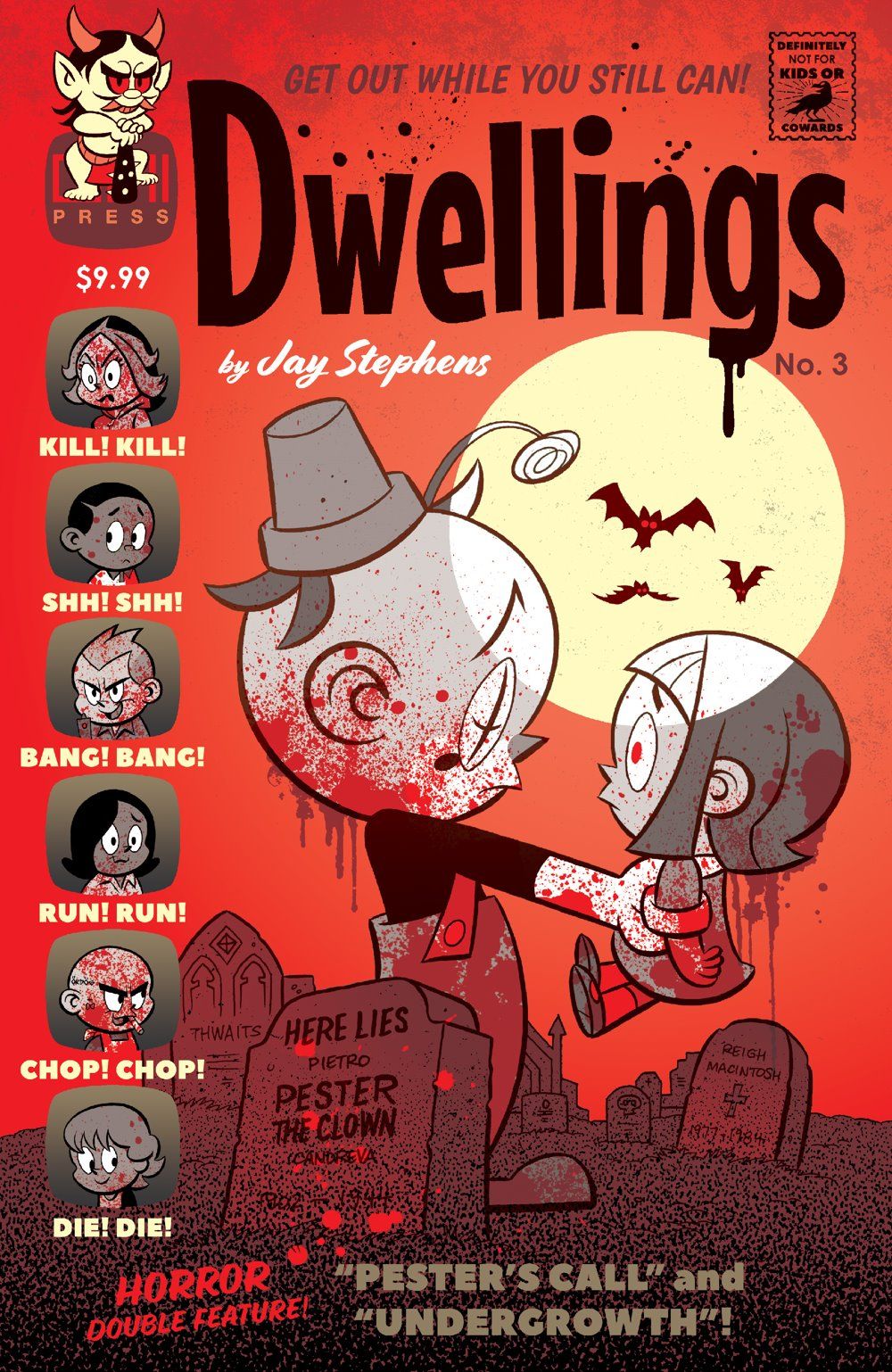In comic shops everywhere December 27th, DWELLINGS #3 sees the series return to the scene of the crime for one FINAL scare as readers are welcomed back to Elwich—where murderous and horrifying secrets sleep just below the pristine surface, slithering in the shadows of this otherwise quiet and idyllic small town. The dementedly delightful mashup from Emmy Award–winning, Eisner Award–nominated cartoonist and animator Jay Stephens (Secret Saturdays, Jetcat Clubhouse) returns from the grave for two more tales of small-town horror. Readers with coulrophobia beware: in this issue, creepy clowns are quite the scare! See for yourself the shock, terror, and fun (?!) that is . . . Jay Stephens' DWELLINGS.