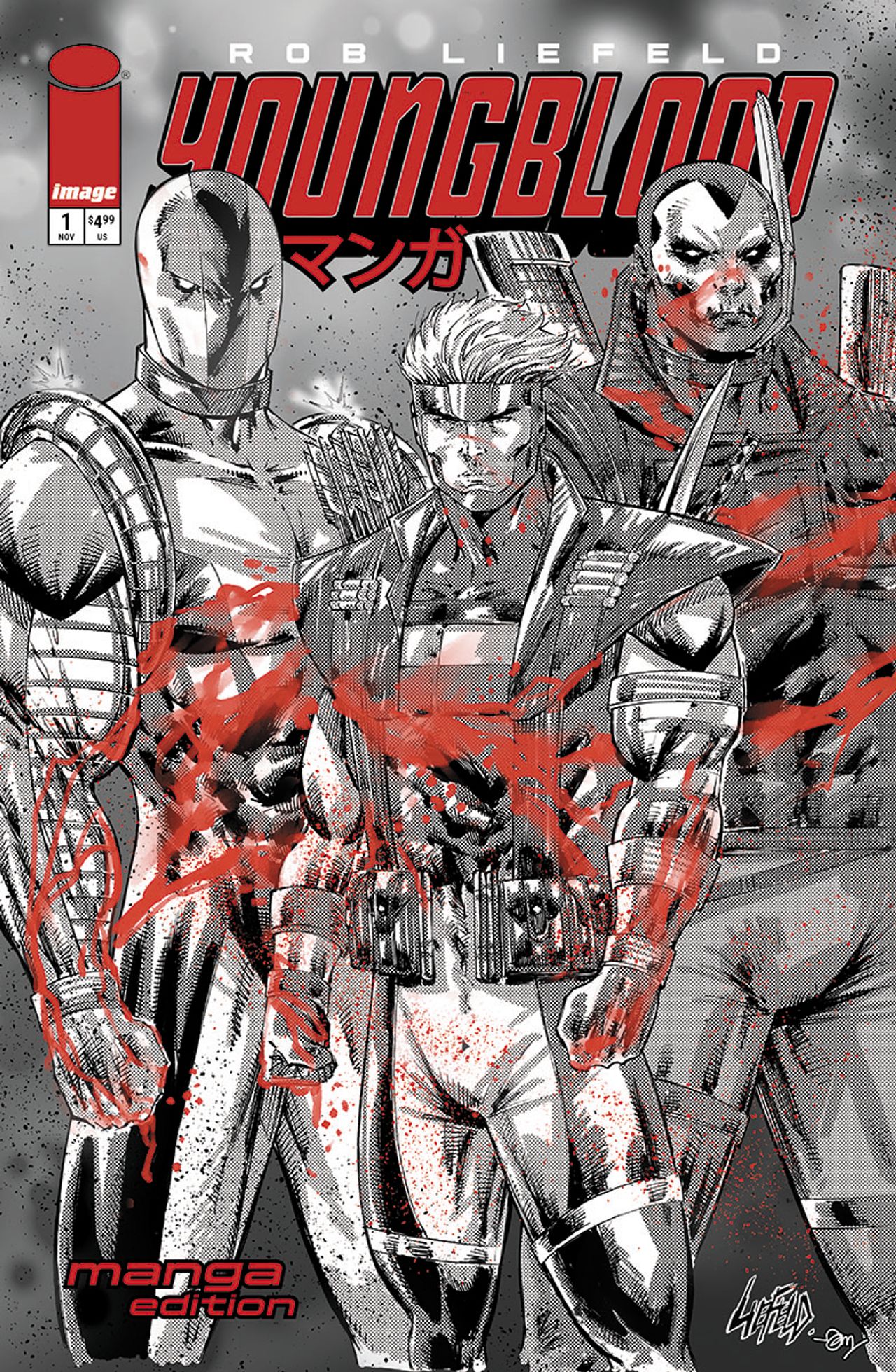 Rob Liefeld's Youngblood return next month features ultra-rare, Manga-inspired black-and-white Cover M editions with red accents, a must-have for collectors.