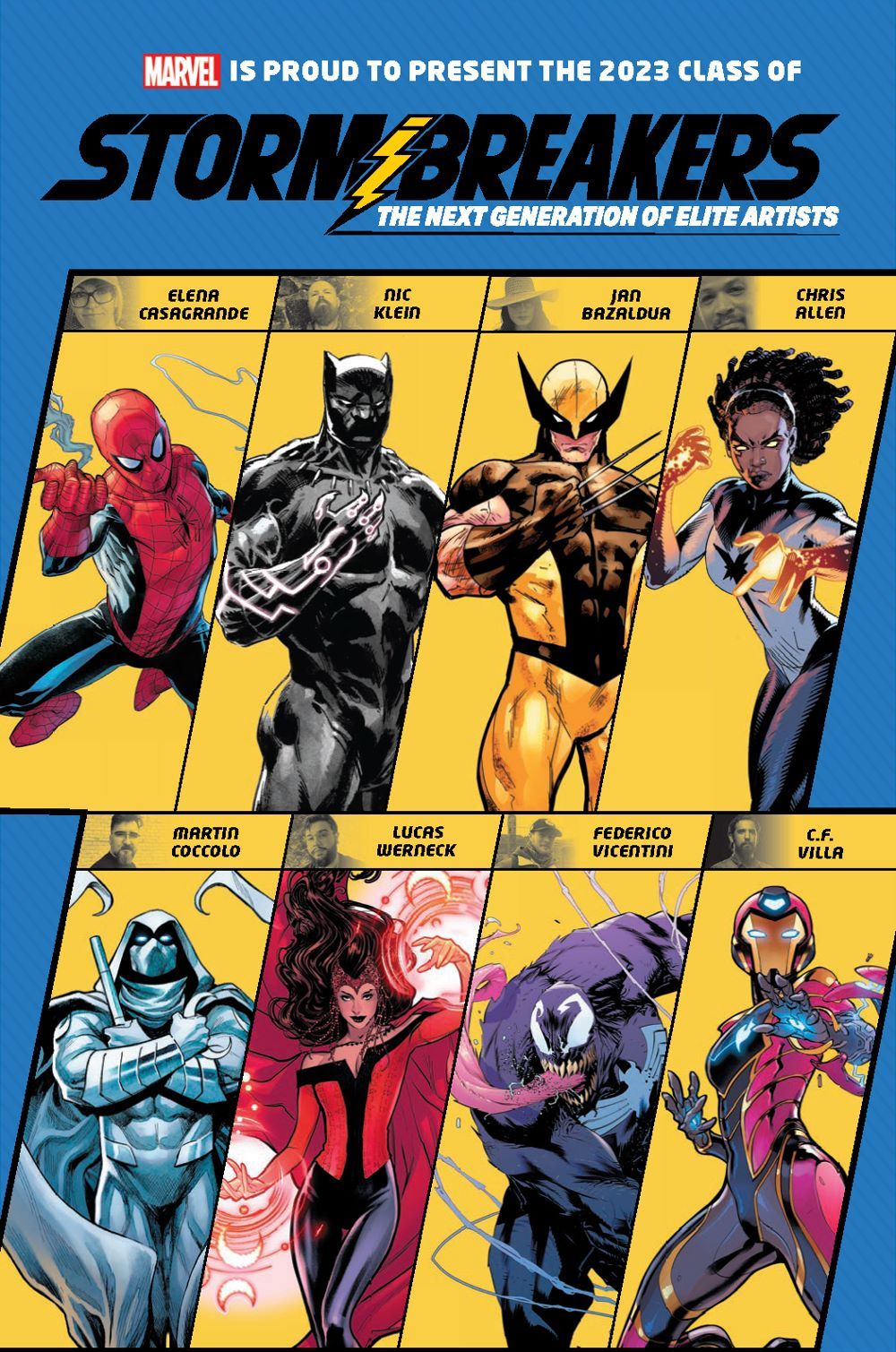 The creators in the new class, selected for their style, achievements, and groundbreaking work, include Elena Casagrande (Black Widow), Nic Klein (Thor), Jan Bazaldúa (Legion of X), Chris Allen (Miles Morales), Martin Coccolo (Deadpool), Lucas Werneck (Immortal X-Men), C.F. Villa (X-Men), and Federico Vicentini (X Deaths of Wolverine).