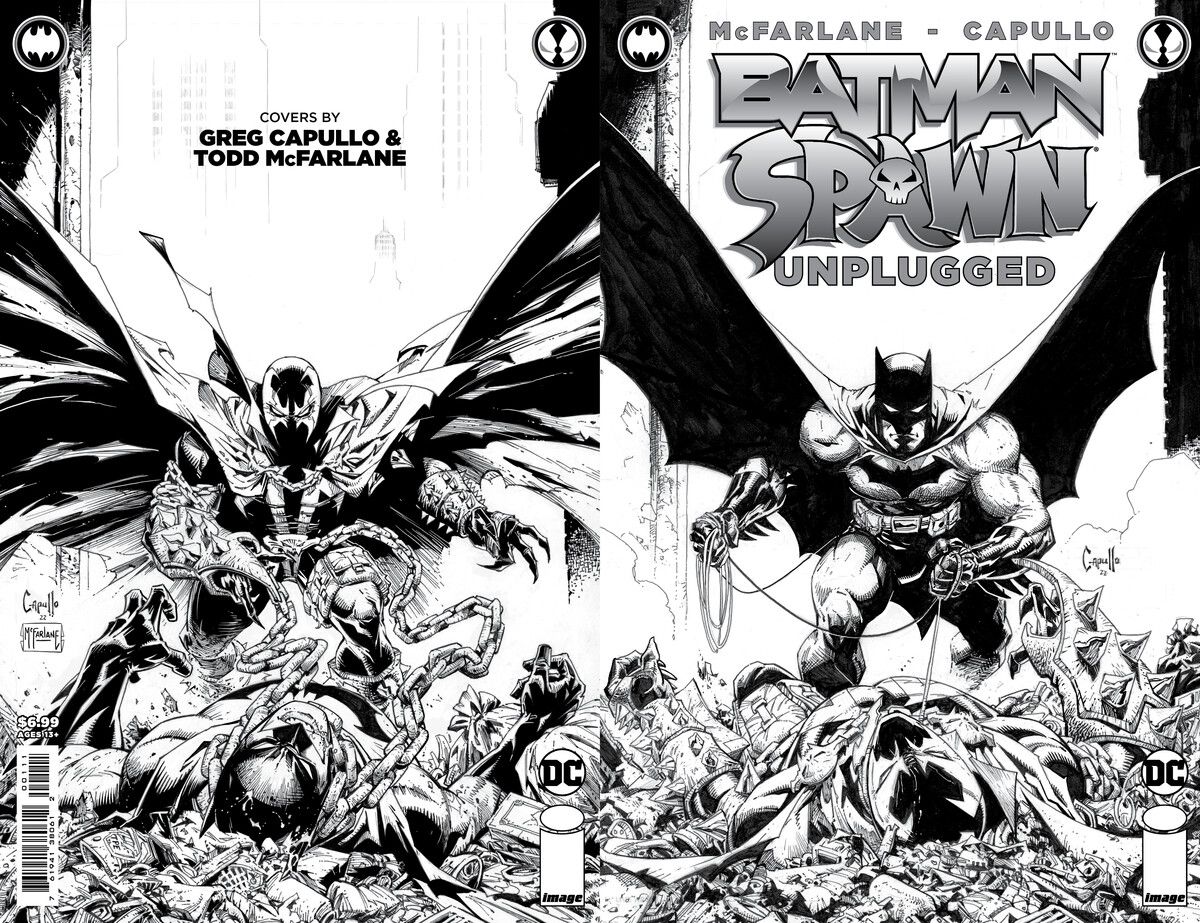 Media Release -- The comic book crossover of the year, Batman/Spawn, will put the artwork front and center in Batman/Spawn: Unplugged. The unlettered, inks only version of the Batman and Spawn team-up will highlight the art and inks by industry icons Greg Capullo and Todd McFarlane when it's available at local comic shops on February 14.