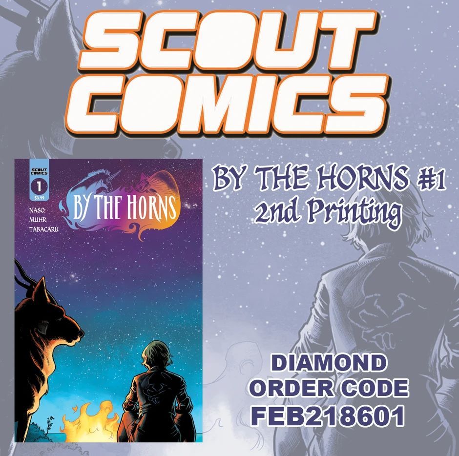 Media Release -- From Scout President James Haick: "Another amazing Scout title has gone back to print and is now available for preorder! The first issue of BY THE HORNS was a big hit for us and we highly recommend grabbing this second printing before issue two hits the stands next month. Please use THE following order code when requesting at your local comic shop!"