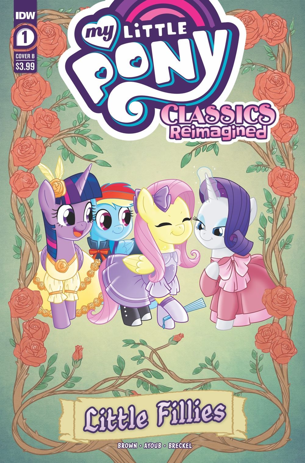 My Little Pony: Classics Reimagined—Little Fillies, written by Megan Brown, illustrated by Jenna Ayoub, and colored by Heather Breckel, is a new series about love, life, and sisterhood. Rainbow Dash, Twilight Sparkle, Fluttershy, and Rarity take on the roles of the March sisters, dreaming of life beyond Broncord, Massahoofetts. Rainbow Dash in particular yearns for excitement—something to write about. So when Applejack, the Marches' neighbor, arrives home with tales of eel-wrangling and apple-eating, Rainbow Dash and her sisters dare to hope for more.