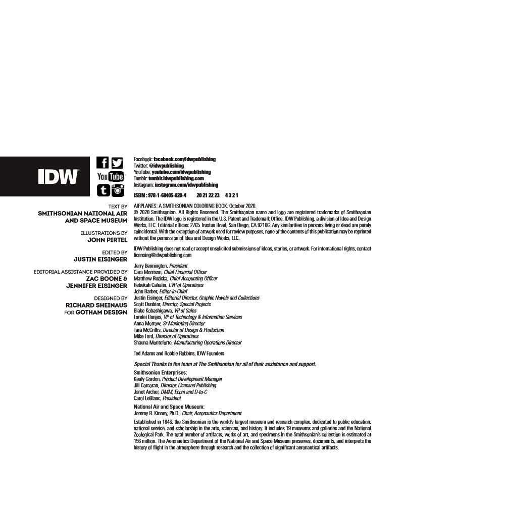 The greatest aircraft of all time are lifting off againyour help! The Smithsonian's National Air and Space Museum and IDW Publishing present a fascinating new coloring book that provides a beautiful and informative tour through the high-flying world of airplanes.