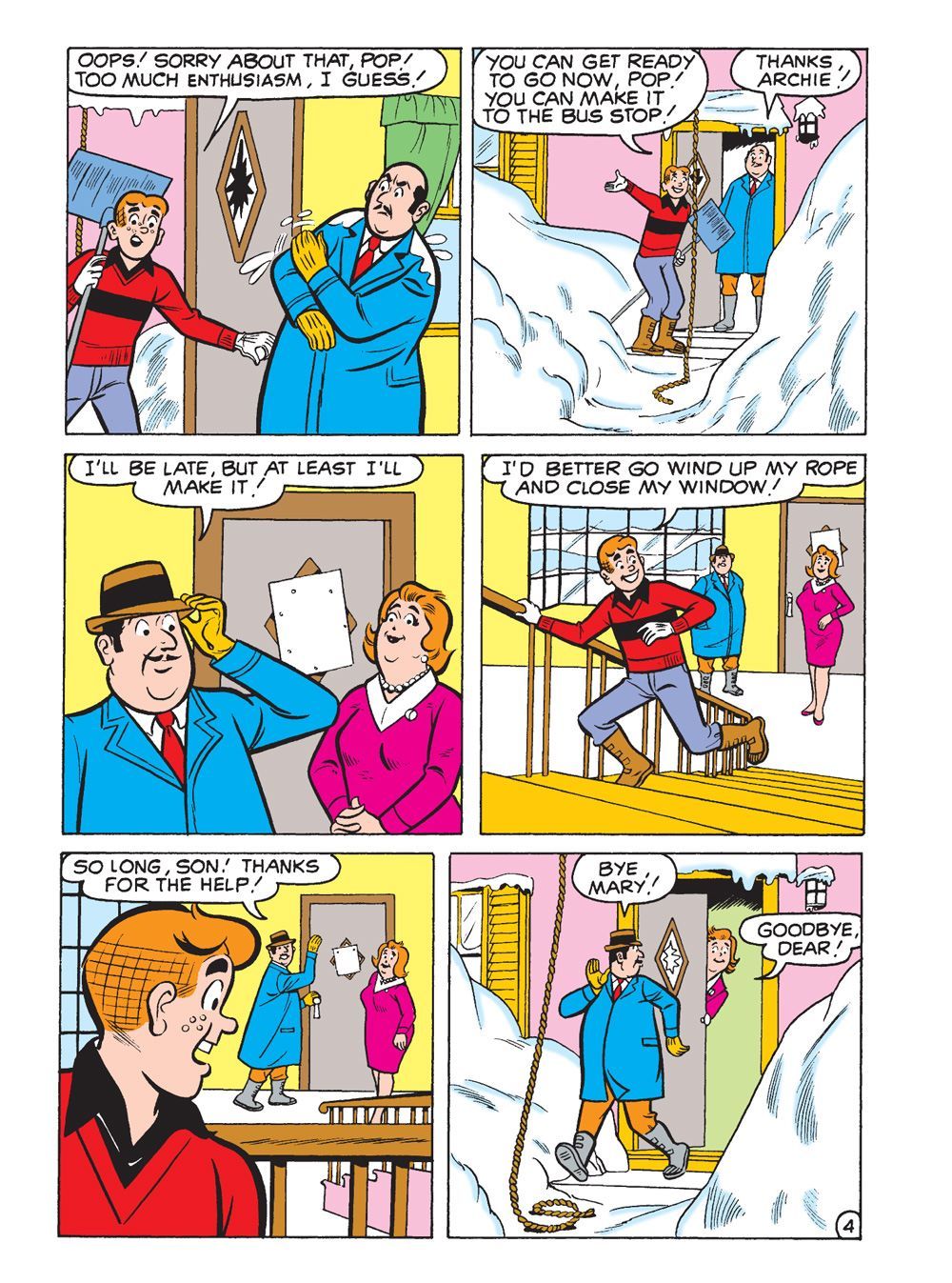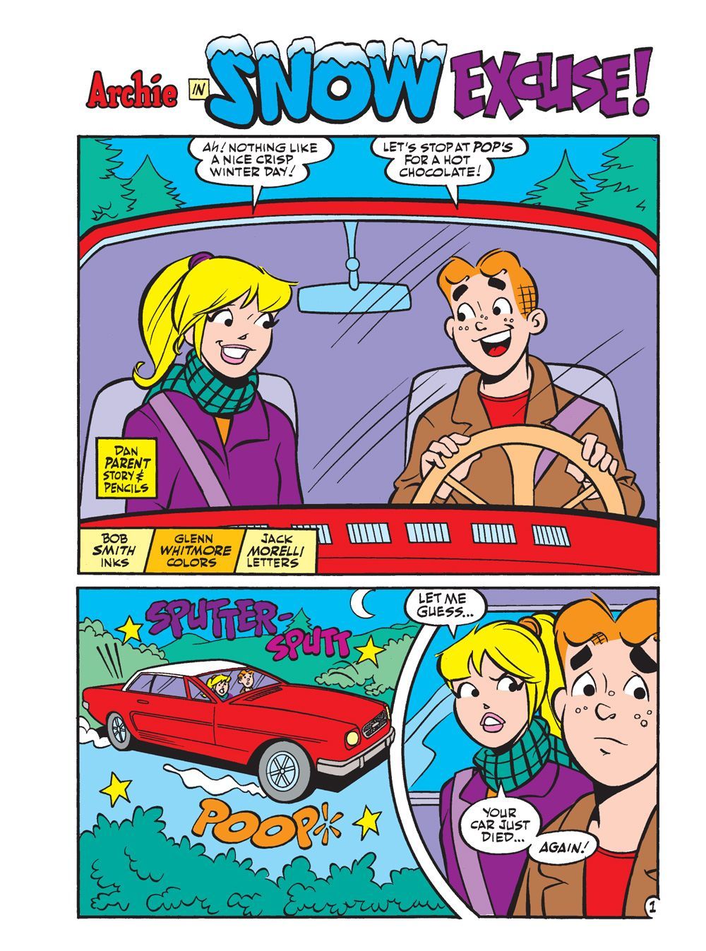 NEW CLASSIC-STYLE STORY: "Snow Excuse" Archie brings his car to school for some "free" repairs, courtesy of Riverdale High shop class. Unfortunately, prankster extraordinaire Reggie is in his shop class, and he gets a few of their classmates to pull an over-the-top seasonal prank: namely, turning Archie's car into a snowmobile! What will happen to Archie's beloved Ol' Betsy next? And when it starts to snow, will Reggie's practical joke actually be practical?