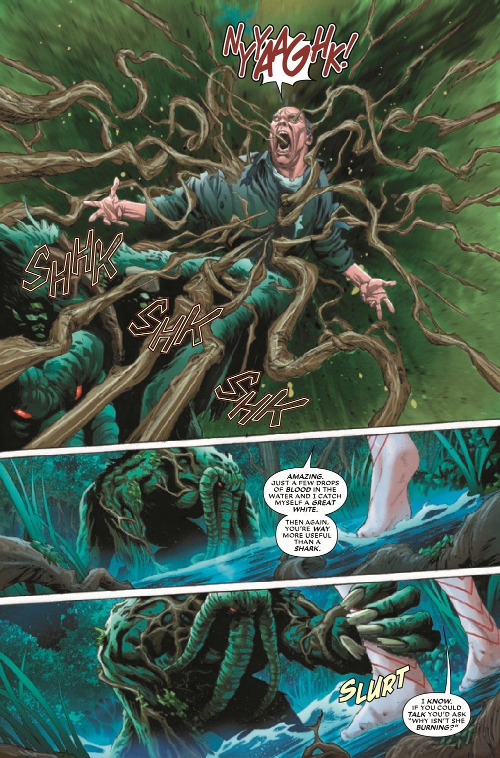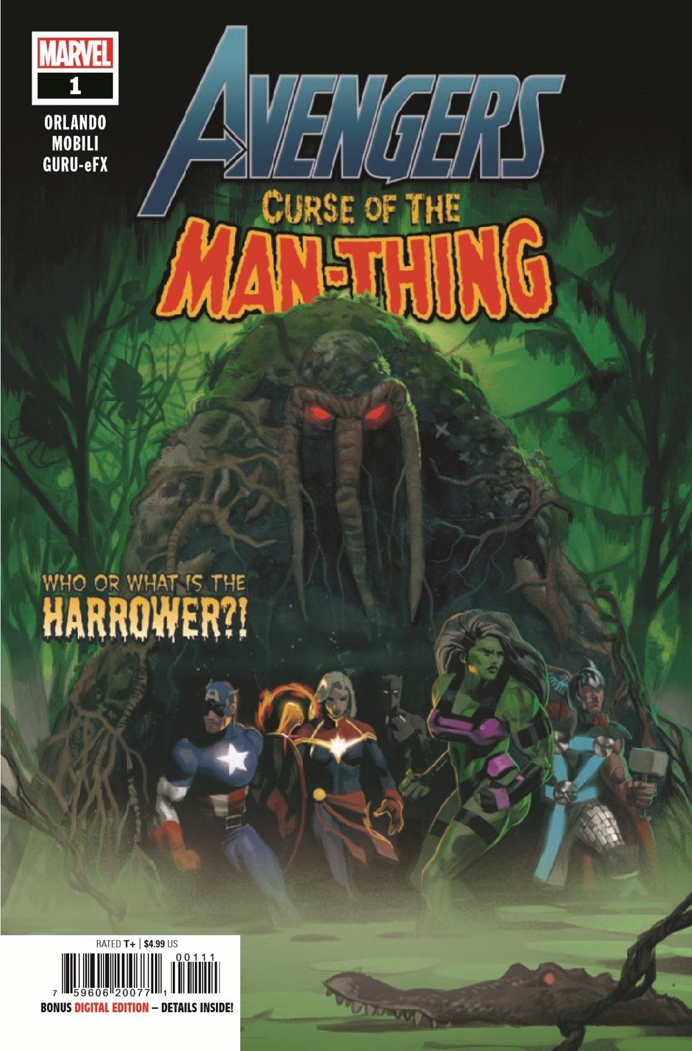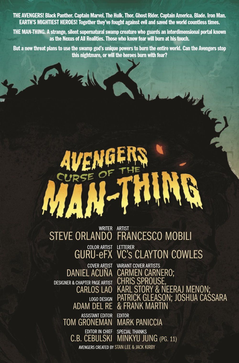 BURN AT THE TOUCH OF THE HARROWER! Critically acclaimed writer Steve Orlando (Martian Manhunter, Batman, Wonder Woman) makes his Marvel debut with a blockbuster celebration of MAN-THING'S 50TH ANNIVERSARY! For decades, the Man-Thing has haunted the Florida Everglades. Now a new enemy has hijacked his body on a quest to take his incendiary abilities global! We wake to fear as gargantuan monoliths menace cities worldwide, with only the AVENGERS standing between the population of Earth and a planetwide inferno. Can they save Man-Thing in time to douse the fires? And does the man inside the thing, TED SALLIS, even want to be saved? Introducing a sensational new villain, THE HARROWER! PART 1 of 3!