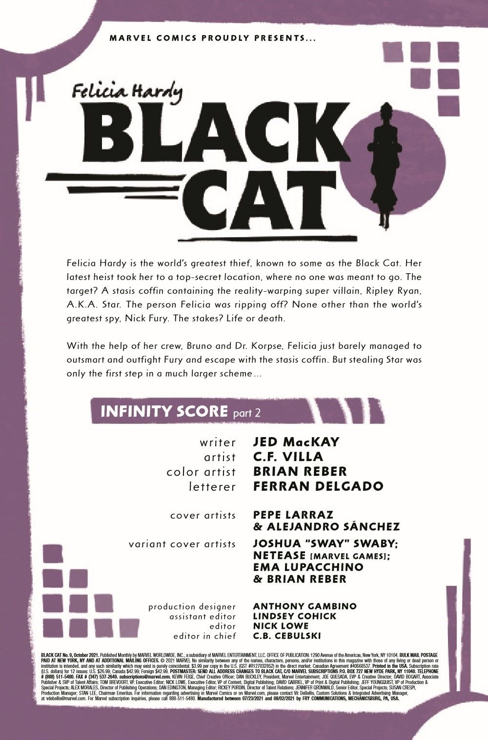 "INFINITY SCORE" Continues! The hottest new character of the last five years, STAR, brings her reality-warping powers to bear in THE BLACK CAT! Who hired Felicia to do this job? Why do they want this infinite power? AND HOW DOES FELICIA THINK SHE IS GOING TO LIVE THROUGH THIS?