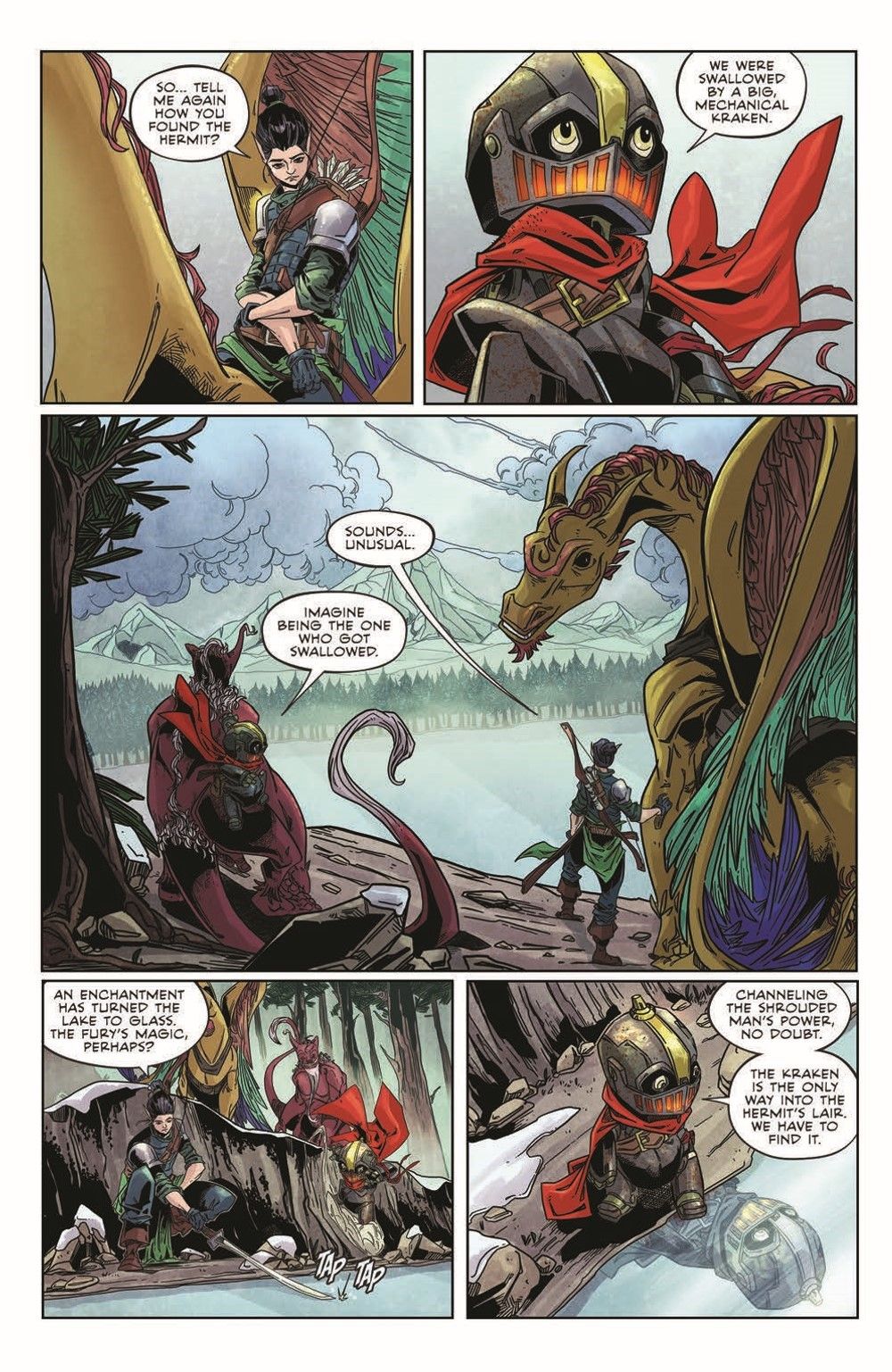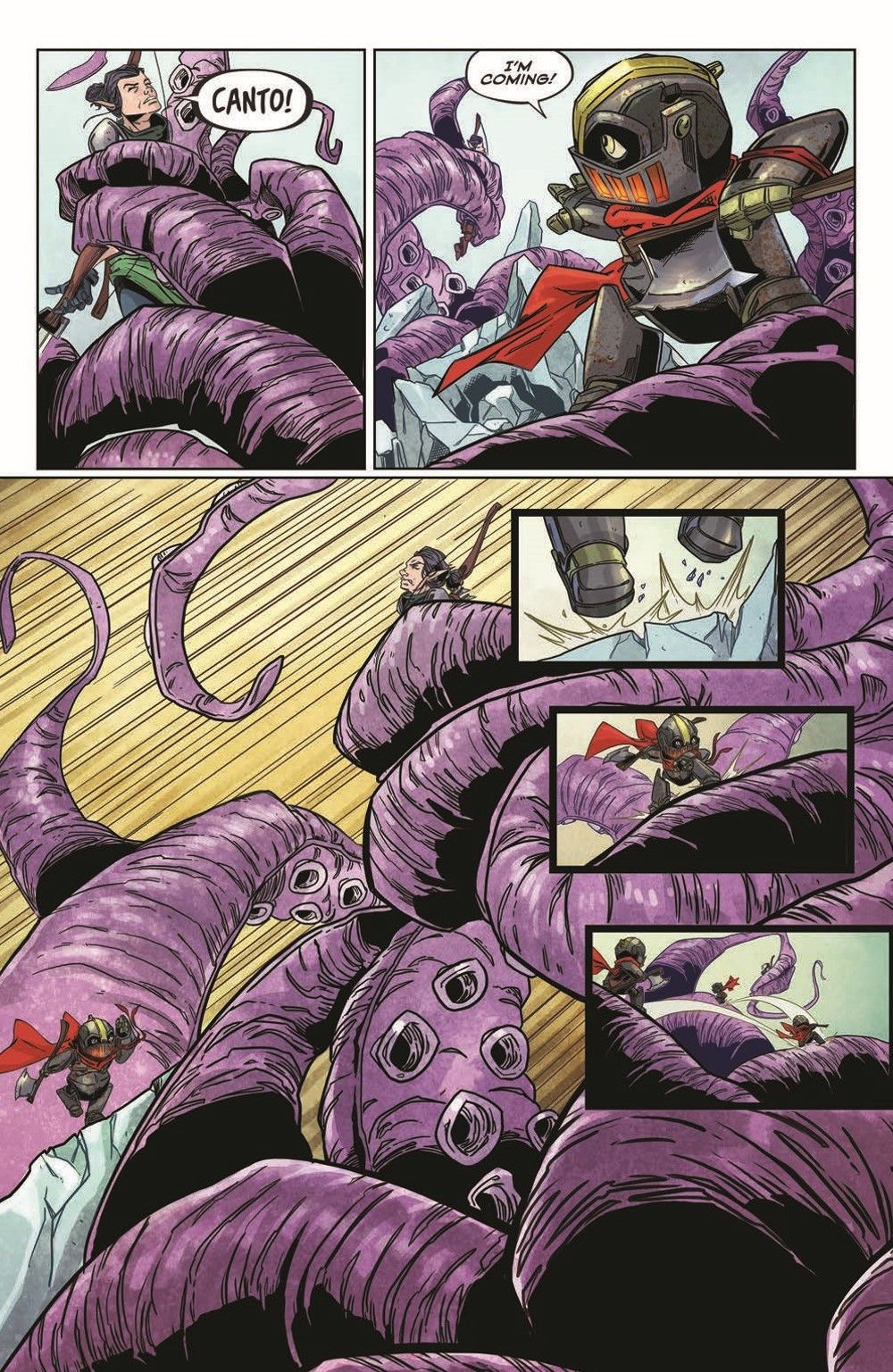 Fan-favorite CANTO continues! The clockwork knight and his old friend, the warrior Aulaura, are in search of allies in their coming war against the Shrouded Man. Possibly the greatest allies they could hope for are Canto's former slavers, but before they can attempt to build bridges and combine their efforts, they must be found! And the only one who knows where they may be is on the other side of a Kraken!