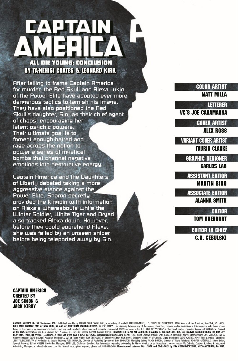 THE FINAL ISSUE OF TA-NEHISI COATES' LANDMARK RUN! "ALL DIE YOUNG" ends here! Ta-Nehisi Coates concludes his run on CAPTAIN AMERICA with an all-out fight to the finish with the Red Skull and the Power Elite!