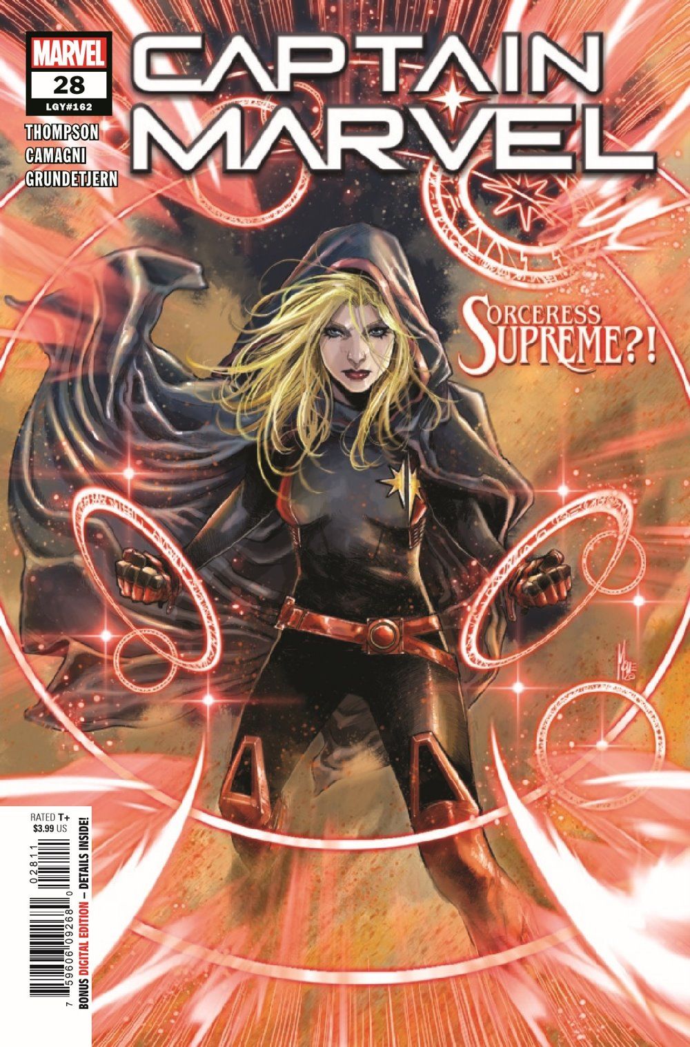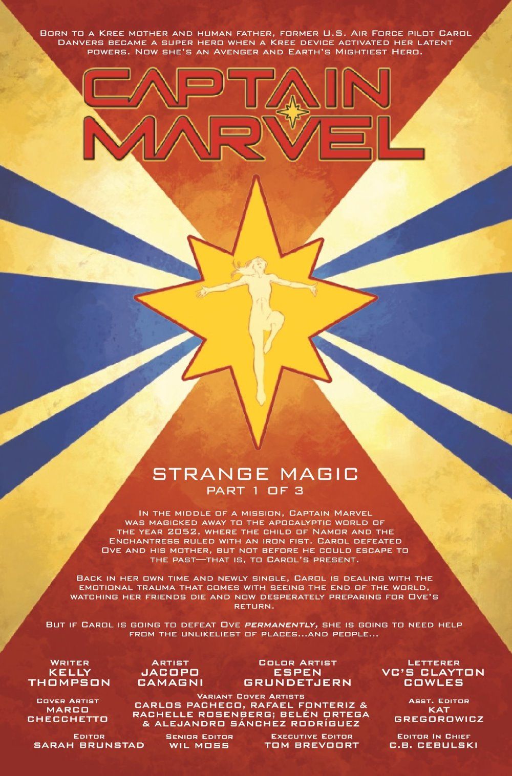 TOIL & TROUBLE! Carol Danvers is a born soldier. Give her a field of battle and an enemy to punch, and she's unstoppable. But the Captain's Achilles' heel is about to break. The mystic arts are Carol's one true weakness, and - haunted by her failure to stop the villain Ove - she's on a mission to correct that weakness... at any cost. A brand-new arc kicks off with artist Jacopo Camagni's supernatural talents!
