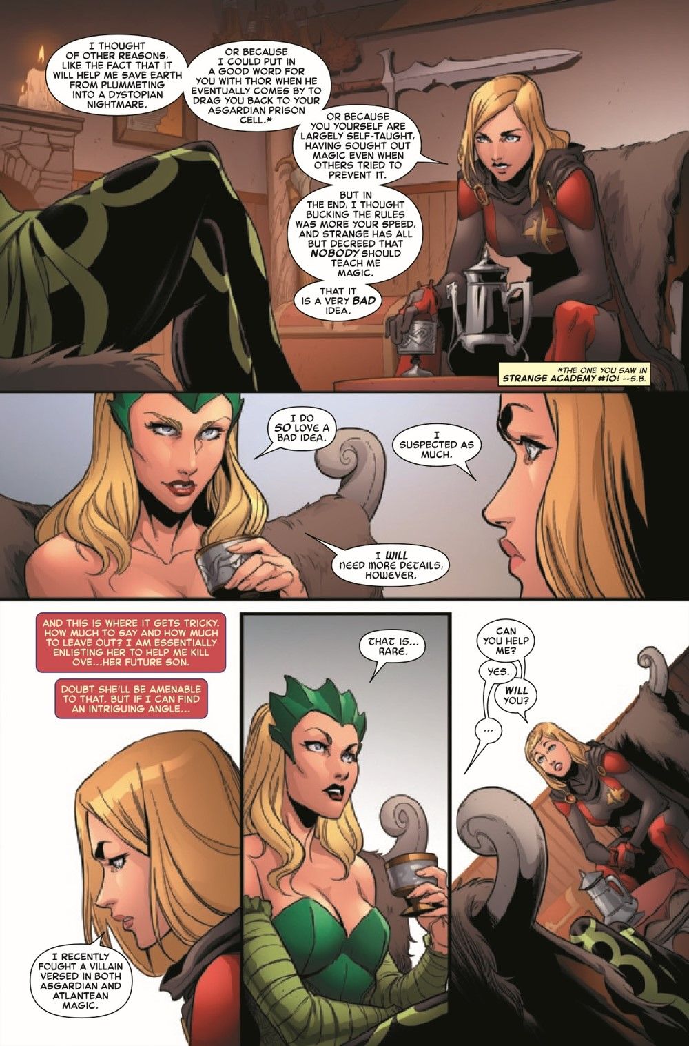 Haunted by a doomed future, Captain Marvel is getting desperate. And that desperation is showing, both in who Carol enlists to help her and the secret she keeps from them as they embark on this adventure together. But Carol's quest for magic continues, as she truly believes it's the last hope to stop a dystopian future, even if every magic user she knows disagrees!