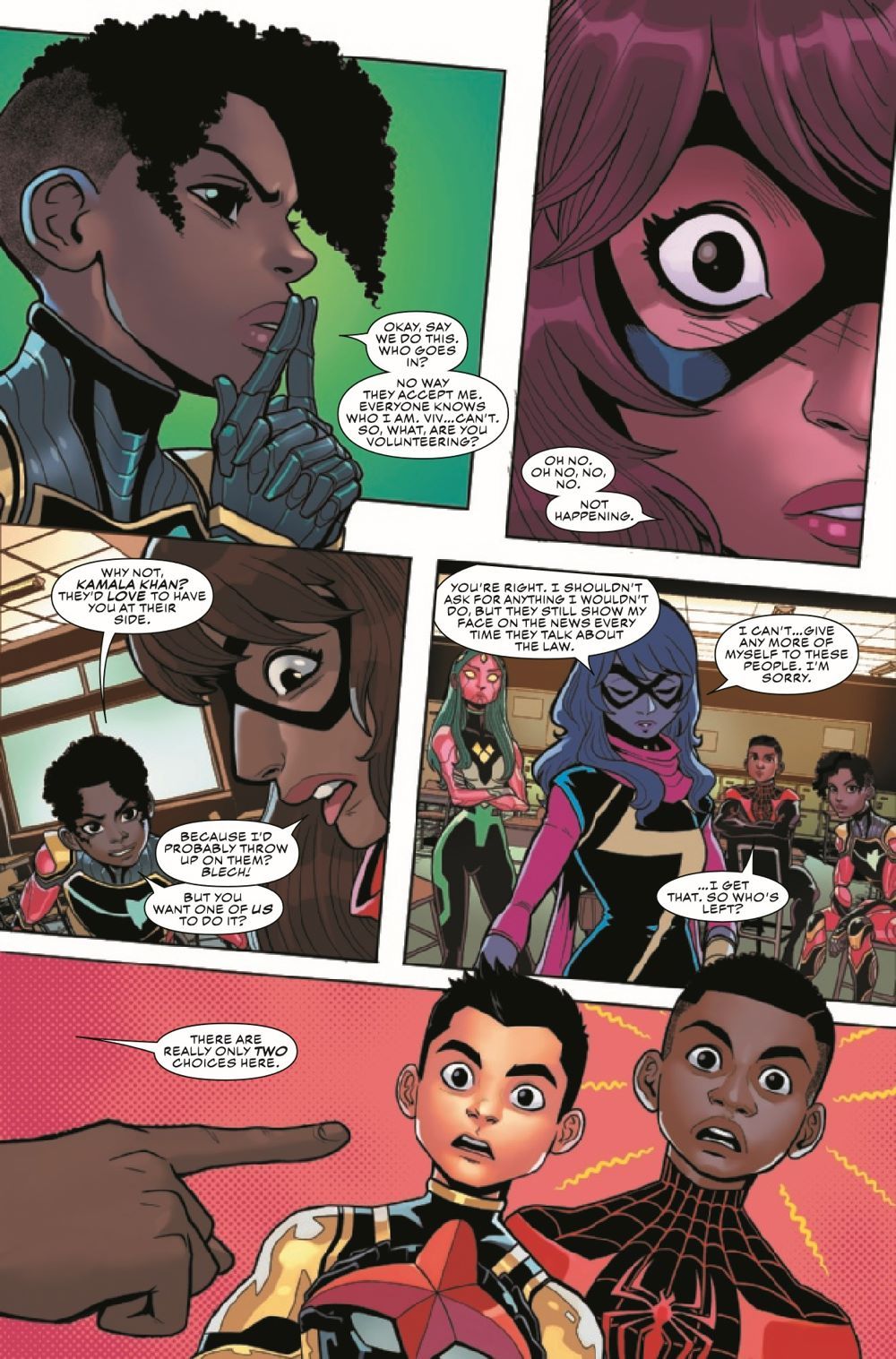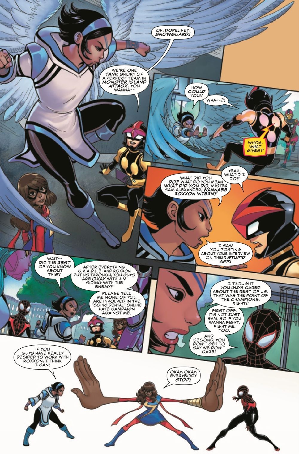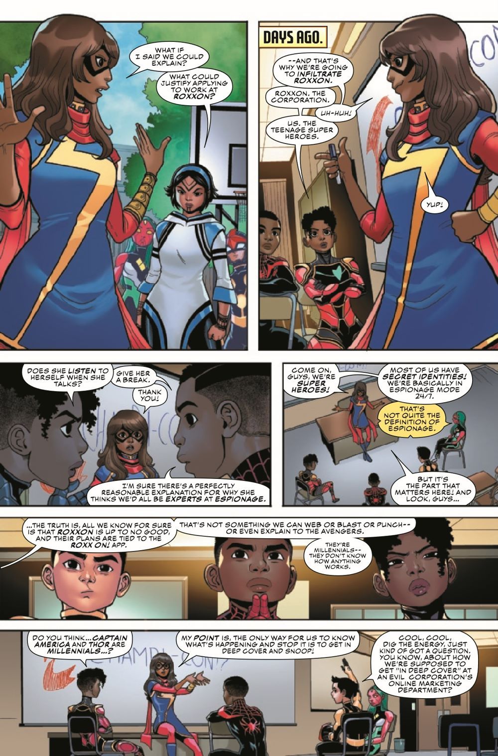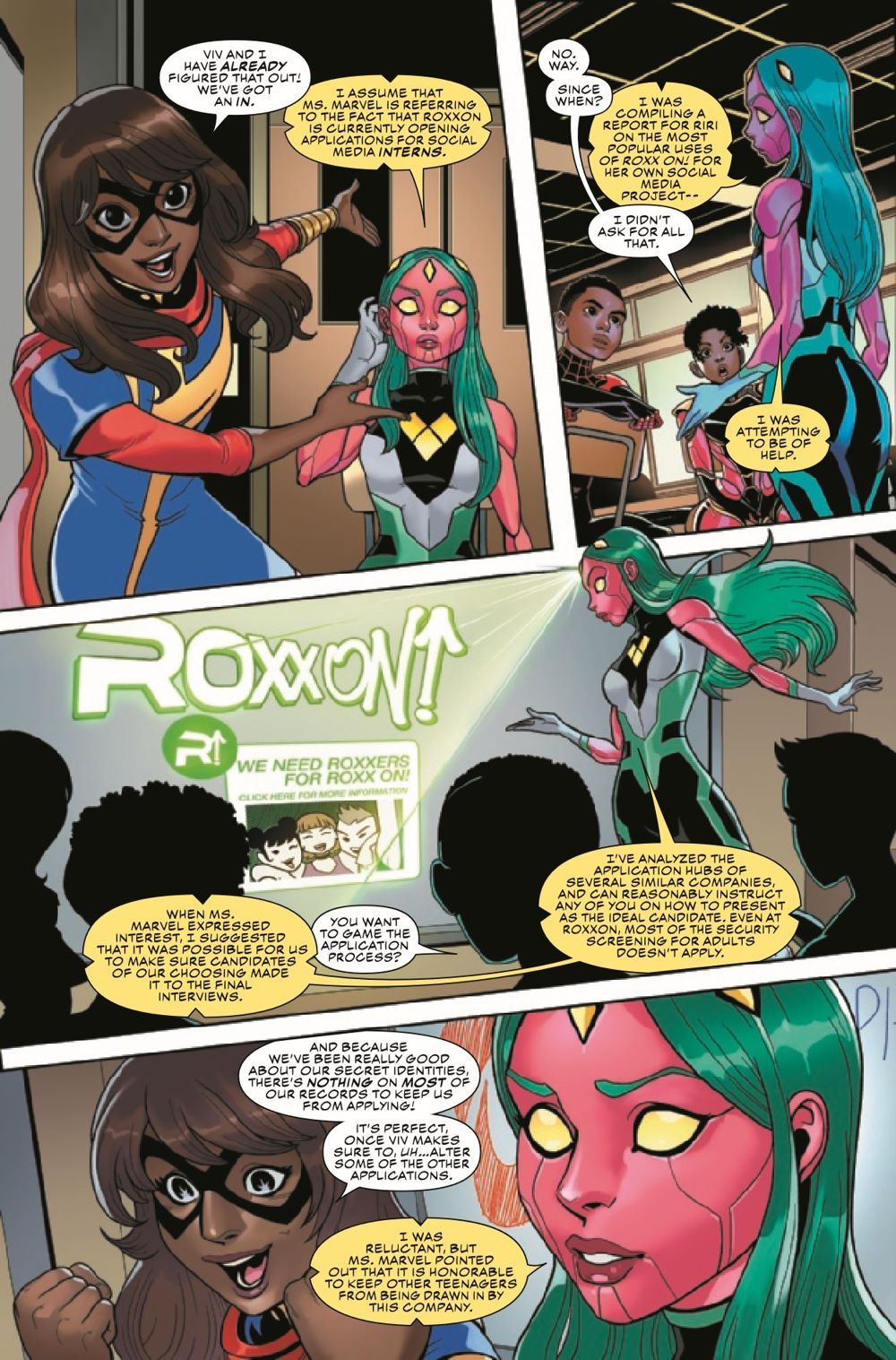 CHANGE THE WORLD! THE KAMALA CON! The Champions are playing dirty to beat Roxxon at their own game - including implanting two of their own as interns to take down the corporation from within. But in order to earn the trust of their cutthroat Roxxon supervisors, they'll have to deliver an unwilling spokesperson: Kamala Khan. Will Ms. Marvel agree to become the face of a company and a law that she hates, or is it too high a price to pay for victory?