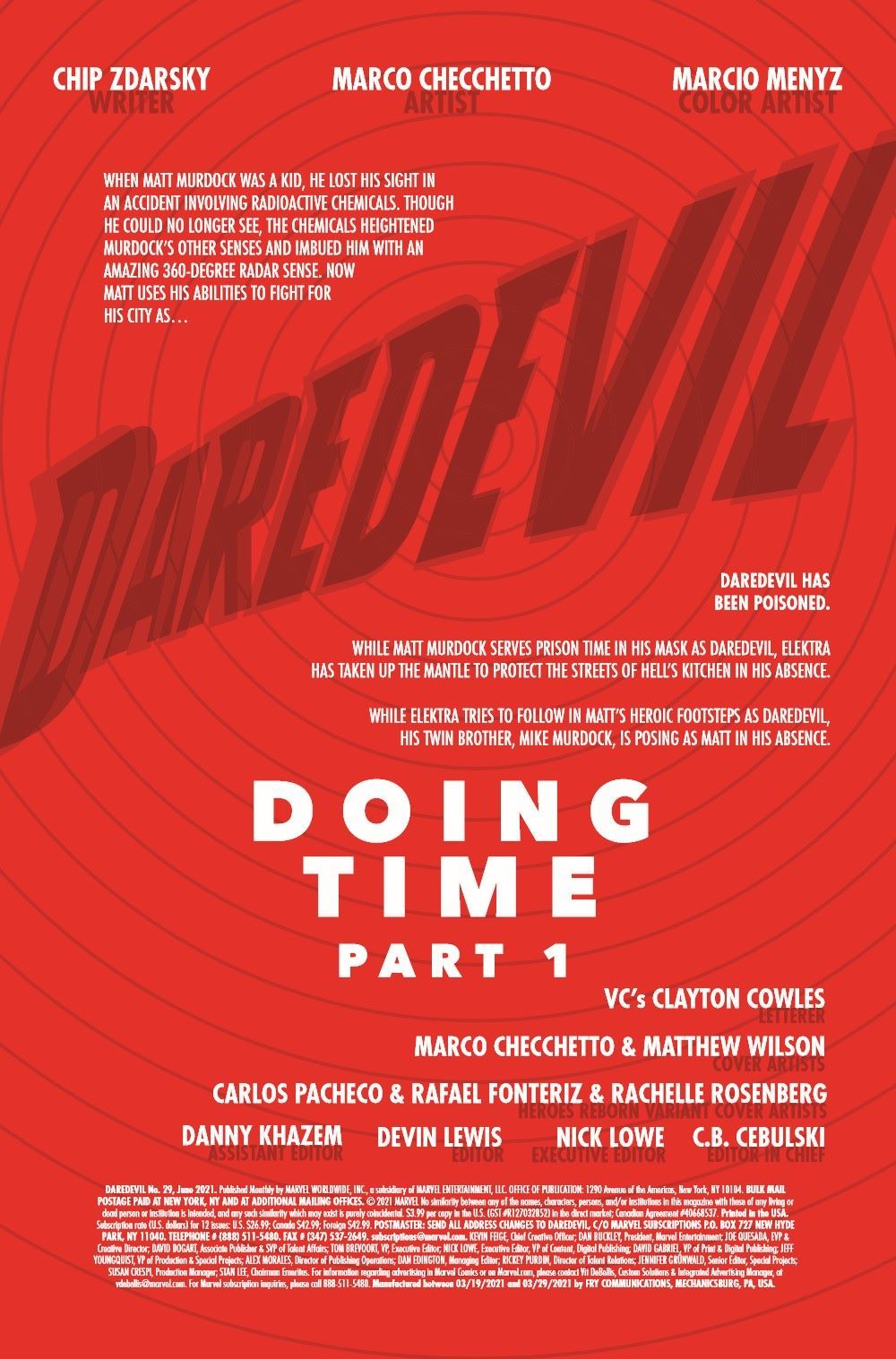 THE TRUTH IS FINALLY OUT: ELEKTRA IS DAREDEVIL! • Having taken up the cowl and the club in Matt Murdock's absence, Elektra, the deadliest assassin in the Marvel Universe, has a long road ahead as she works to protect the legacy of The Man Without Fear! • OLD FOES! NEW FACES! LOST LOVES! After the past six months, just imagine what secrets superstar creators Chip Zdarsky & Marcho Checchetto have up their sleeves!