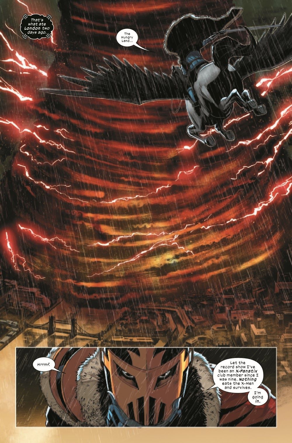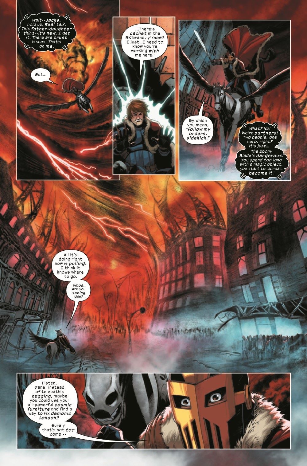 LONDON'S BURNING! THE BLACK KNIGHTS RIDE AGAIN! All manner of vile extradimensional foes invade Earth following the collapse of Doctor Strange's magical safeguards for the planet. Dane Whitman, A.K.A. the BLACK KNIGHT, receives a terrible vision from the EBON SIEGE while Jacks, now sharing the burden of the EBONY BLADE with her father, rides off to confront a terrible evil attacking London - the X-MEN?! Krakoa's greatest heroes have been transformed - but by what?! Jacks, Dane and Faiza Hussain - wielder of the mighty sword EXCALIBUR - must team up to save the X-Men before an even deadlier threat destroys them all!