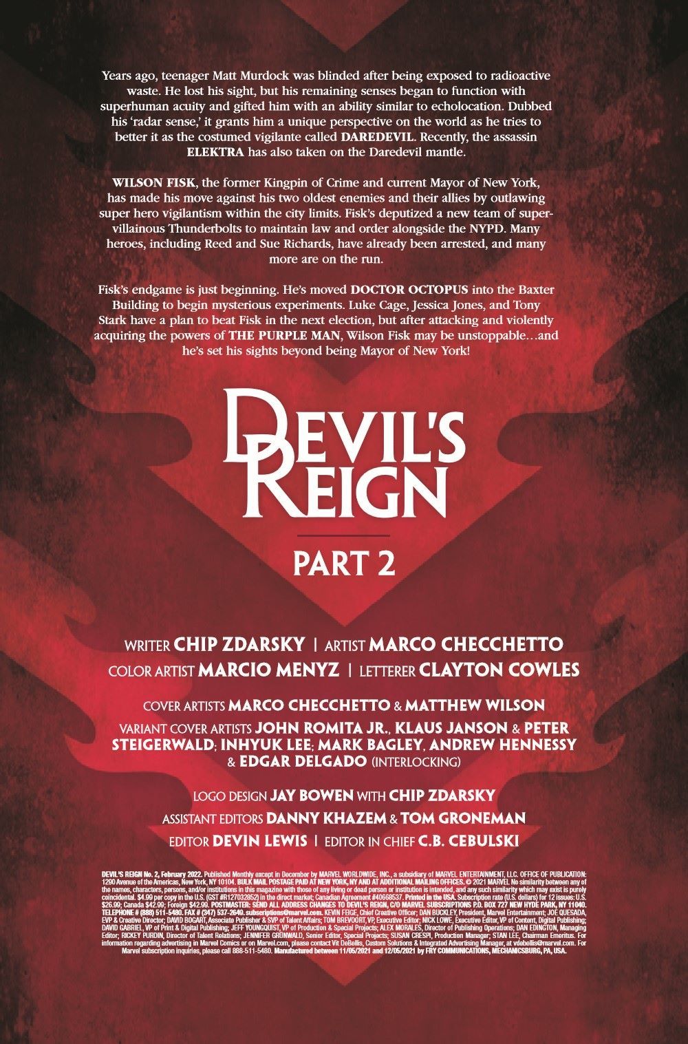 Wilson Fisk has set the Marvel Universe on a dangerous and violent path, hoping to remake it in his own image. Systematically leveraging the power of his office against the heroes of the Marvel Universe, Fisk takes his most dangerous and craven step yet… The THUNDERBOLTS are reporting for duty! ALSO IN THIS ISSUE: Hizzoner isn't the only one with ambitions-the forces he's marshaled do as well. You know what they say about honor among thieves…