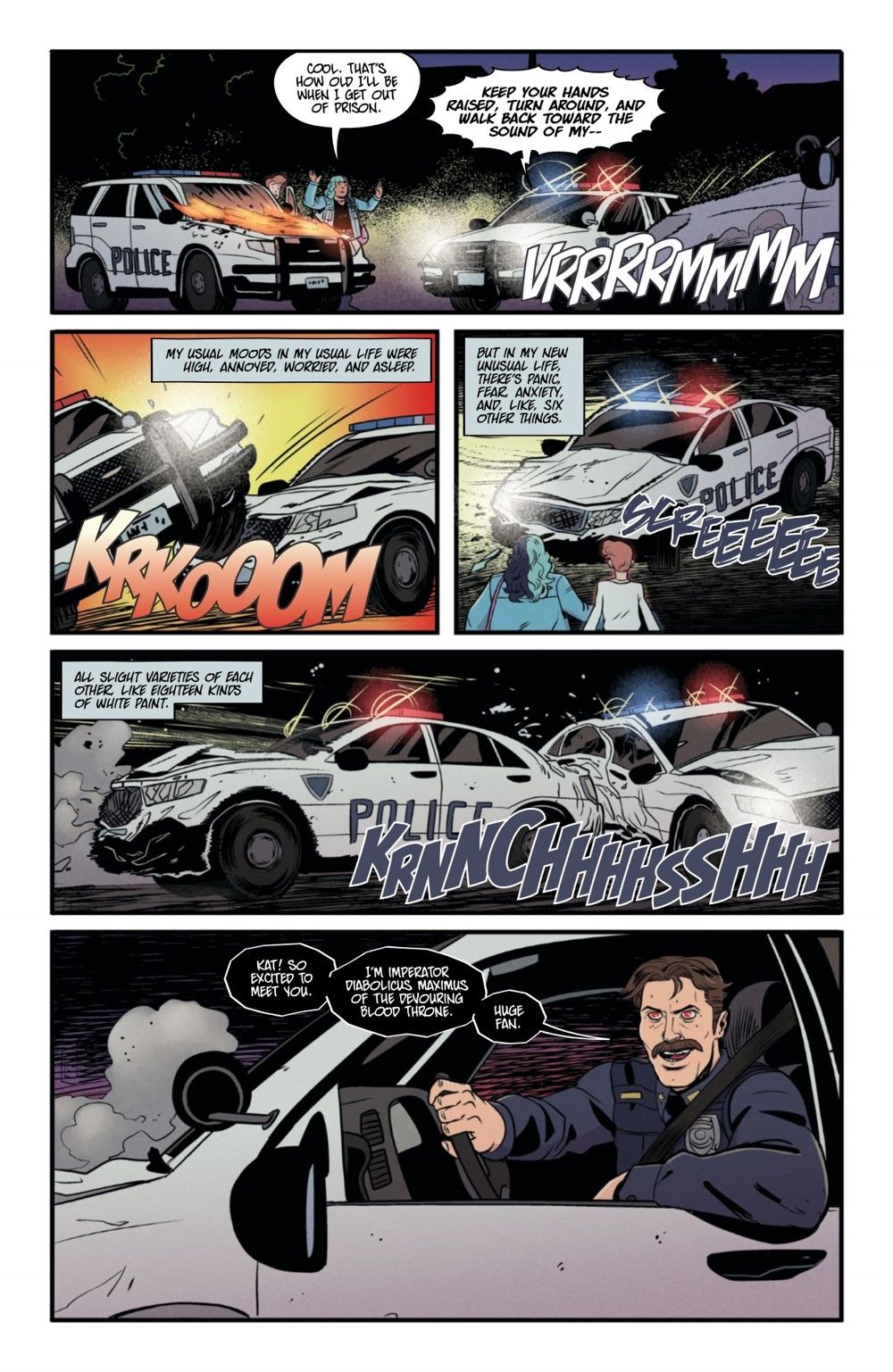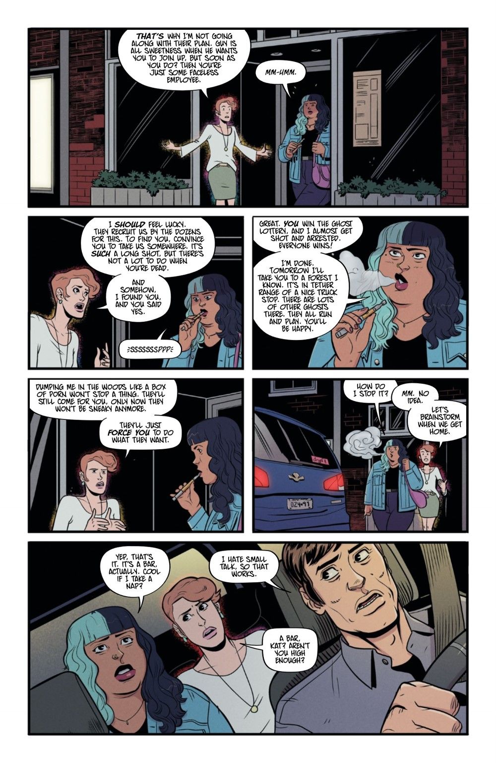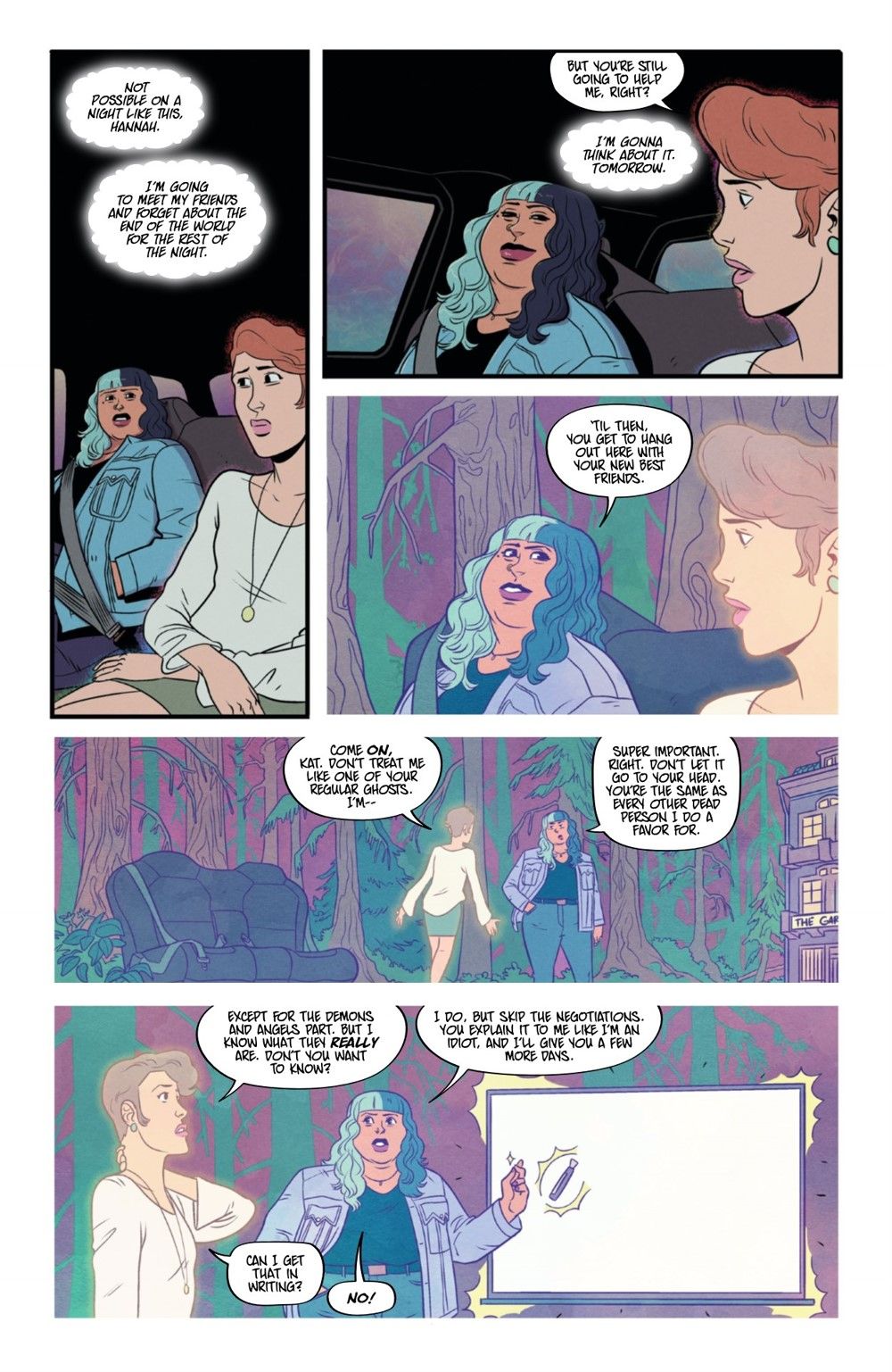 Things are getting bizarre in Kat's world (even more bizarre than her normal day-to-day experiences seeing and speaking to ghosts). Wherever Kat turns, angels and demons are popping up, making demands and trying to sway Kat to join one side or the other. It's all starting to take a toll that even Kat has to acknowledge as her mindscape goes up in ghostly flames. So naturally, Kat's solution is to avoid responsibility and dodge having to deal with any of it by totally checking out and finding distractions—the fun kind. Turns out the road to the apocalypse is paved with downers!