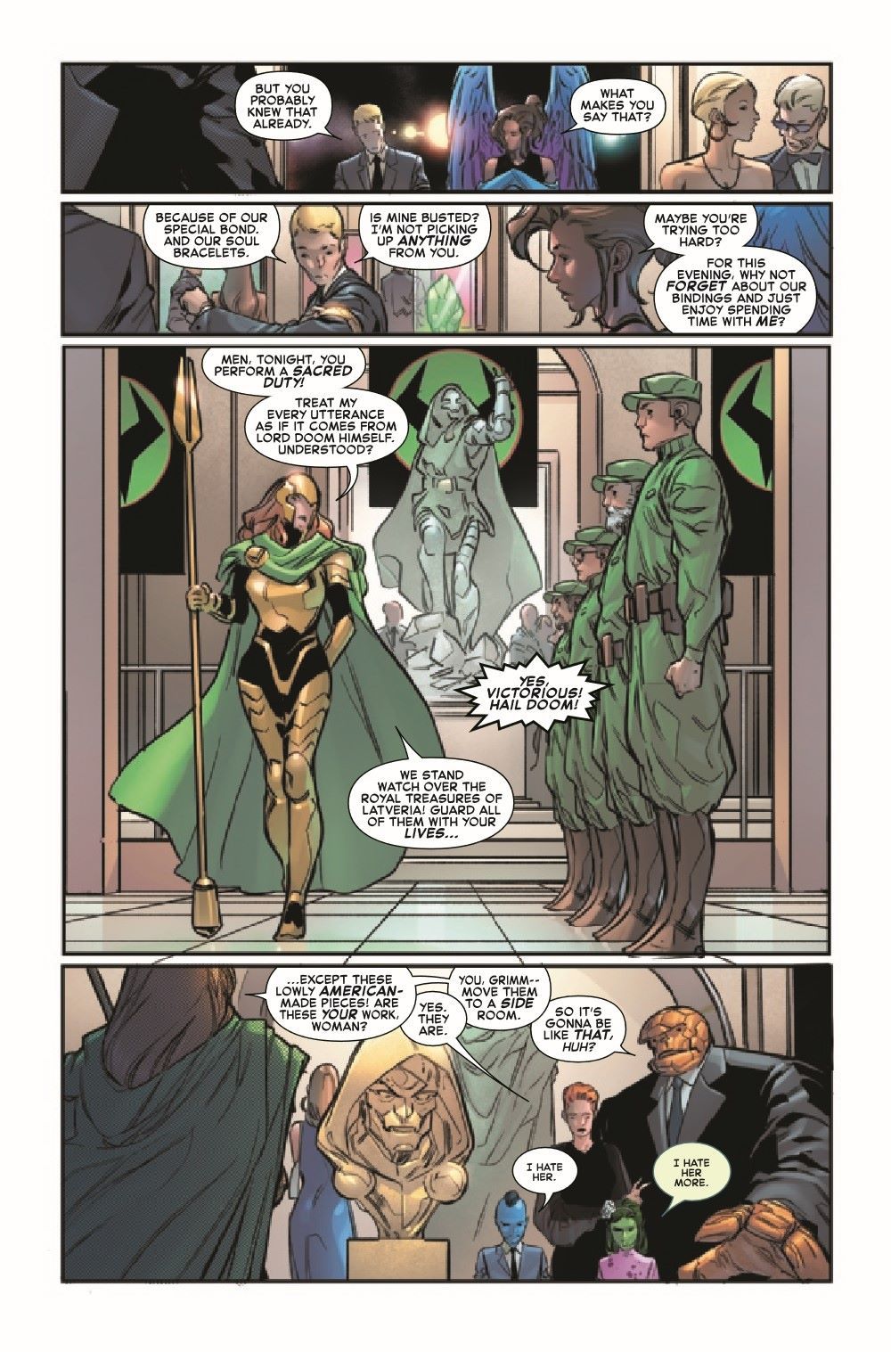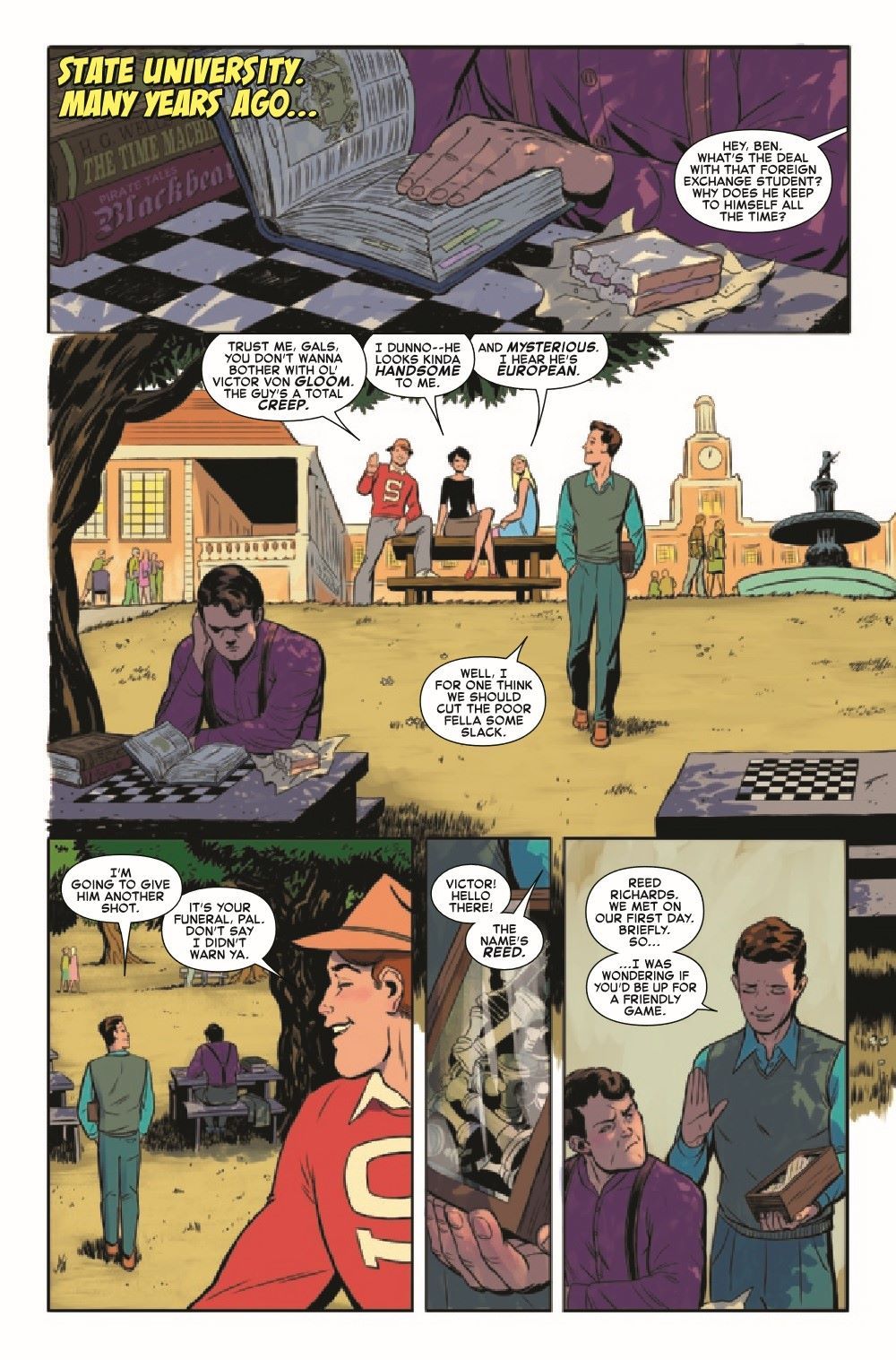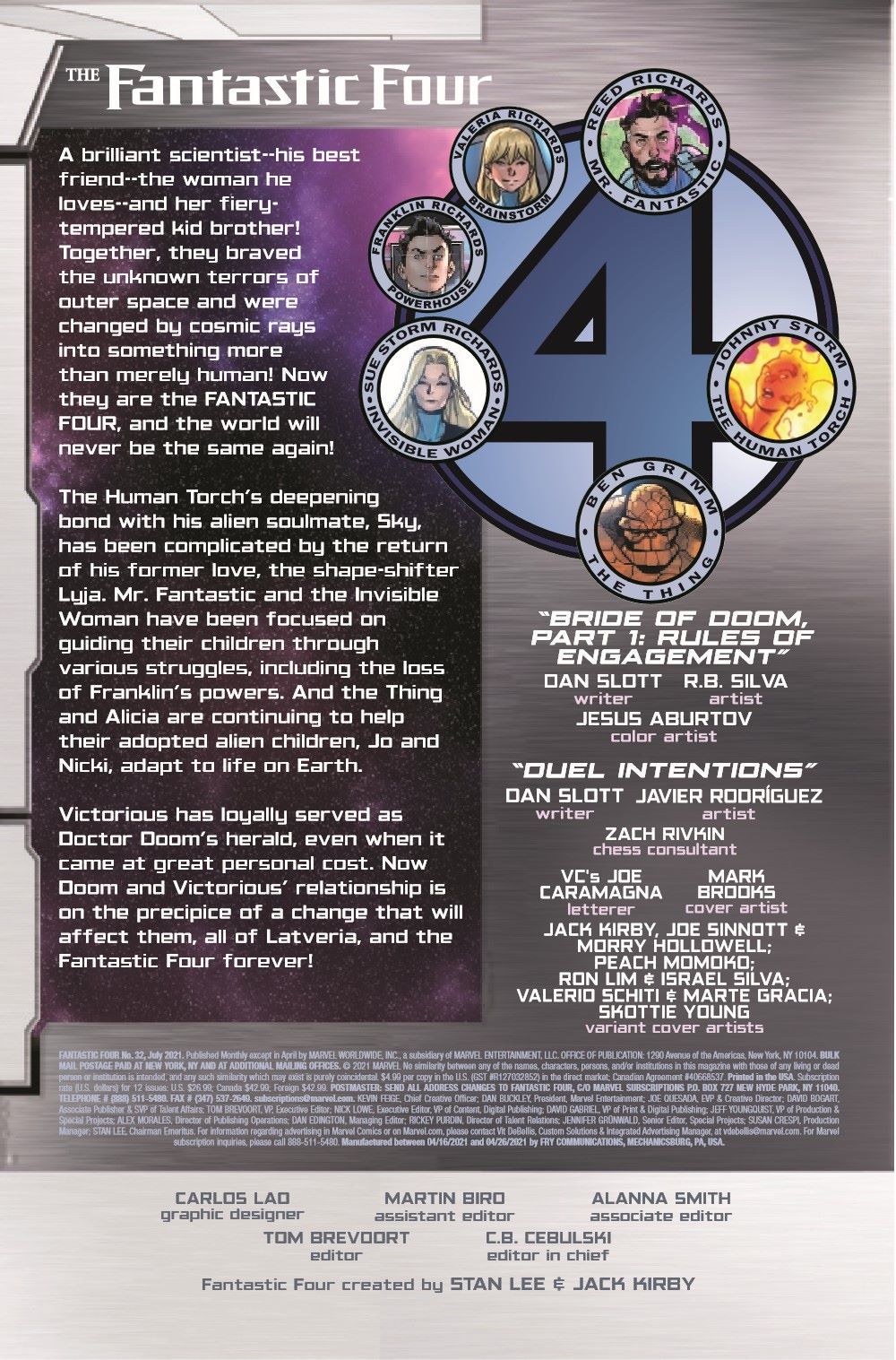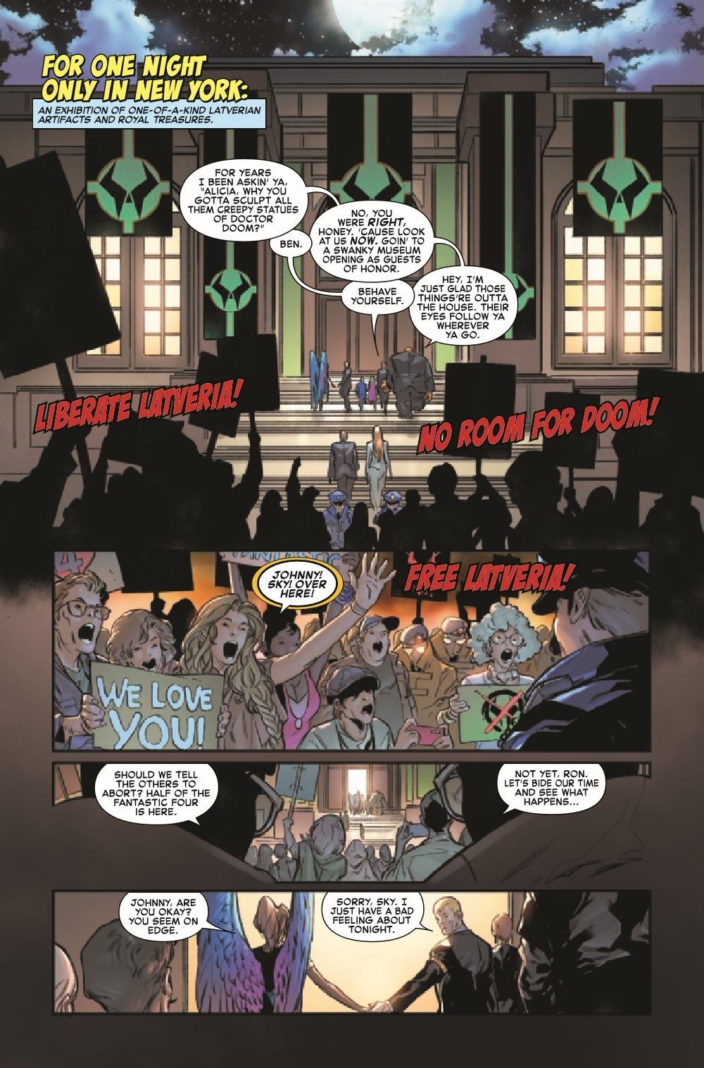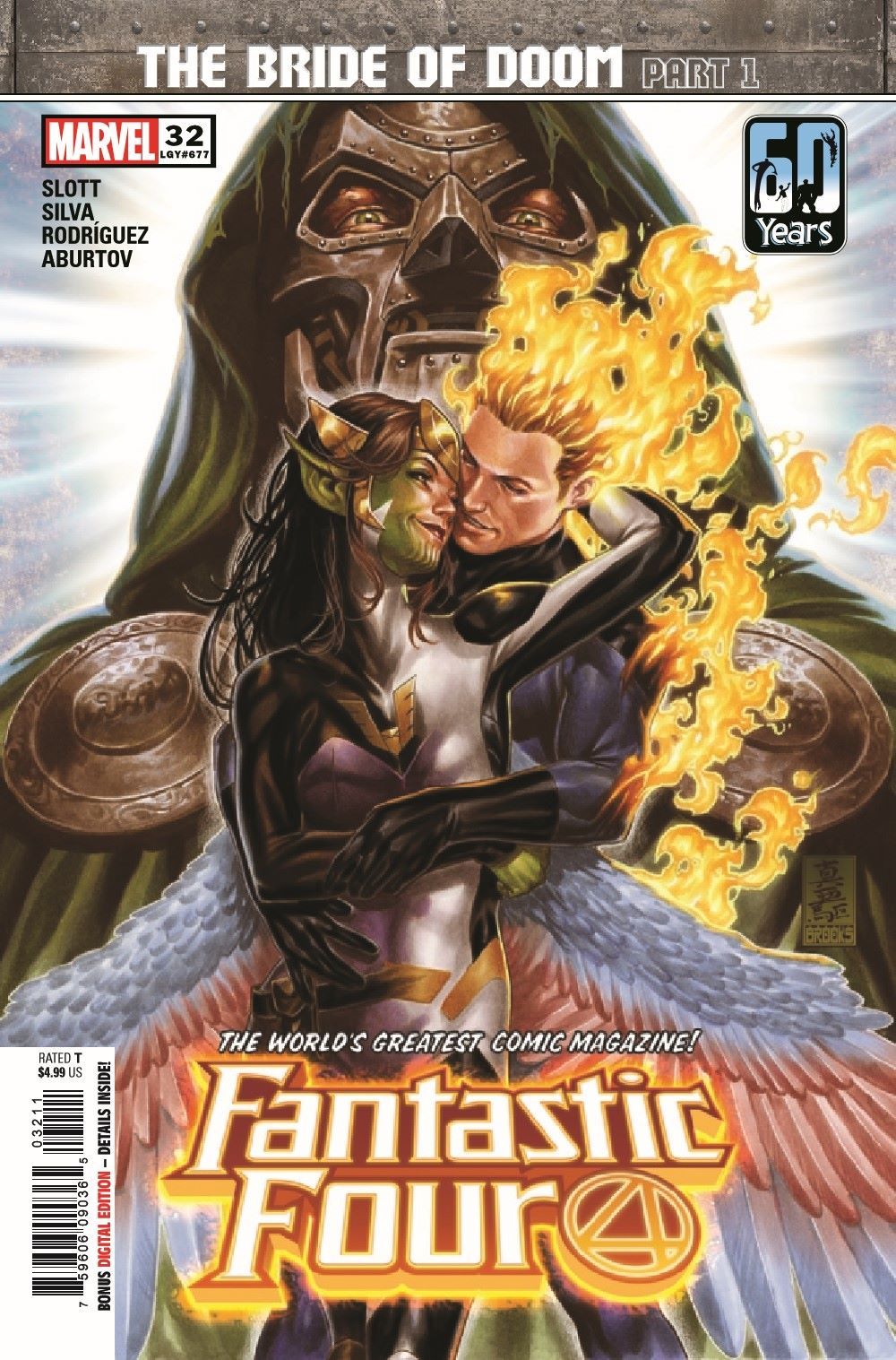 THE BRIDE OF DOOM! Part 1: "Betrothal" The HUMAN TORCH's love life is changed forever when he must choose between his soulmate and his ex-wife... And is Johnny Storm's first heartbreak, CRYSTAL, back in the book?! This is all too much! Fortunately, there is also a lot of punching, hitting and clobbering going on! All this and an ominous decree by DOCTOR DOOM! PLUS: A second tale in which Reed Richards duels Doctor Doom for the strangest prize imaginable!