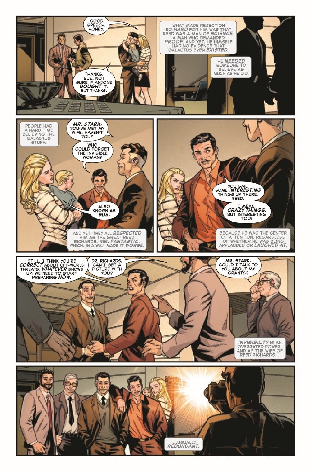 The story of the Fantastic Four's lives in real time continues! Set in the 1970s, the heroes struggle to find their role in a rapidly changing world. Sue continues to fight for social causes while Reed becomes increasingly obsessed with preparing for the impending arrival of Galactus, creating tension within the Four.