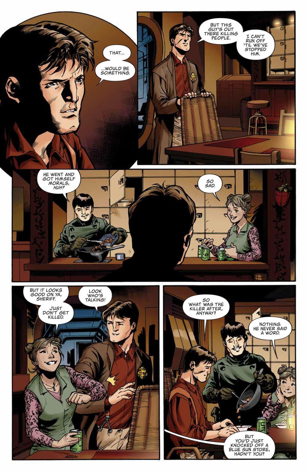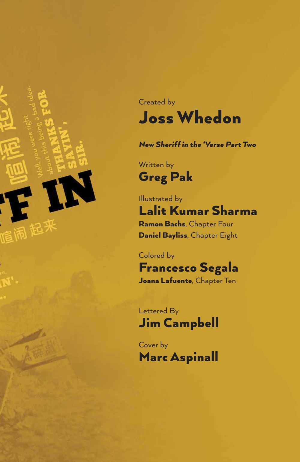 SHERIFF MAL REYNOLDS VS SERENITY?! When the notorious outlaw Mal Reynolds agreed to wear a sheriff's badge, he figured he could change a thing or two about how "justice" is dispensed in the 'Verse. And maybe he did. But his former crew members on Serenity are about to find out if the badge has changed him -- when he finally throws them in jail! With the whole 'Verse turned upside down, a new outlaw appears on the scene., calling himself the Bandit King, and he's bound and determined to take Mal's old position as the most incorrigibly independent law-bender around. Has Mal finally met his match? They say you can't trick a trickster, but in this brand new 'Verse, Mal may be in for the surprise of his life. New York Times best-selling writer Greg Pak (Darth Vader) and rising star artist Lalit Kumar Sharma (Daredevil) present the next exciting chapter continuing Joss Whedon's acclaimed series.