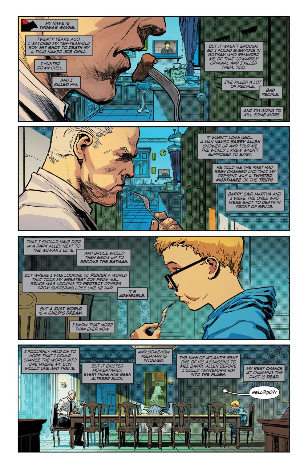 Batman's hunt for the Clockwork Killer brings him to Europe and face to face with the mad king, Aquaman. On the eve of Aquaman's sinking of London, Batman infiltrates his stronghold and goes on the warpath for answers. Nothing matters to Batman, whose world is already dead, but if he can track down the Clockwork Killer, Thomas can save his son's world and put everything back together again.