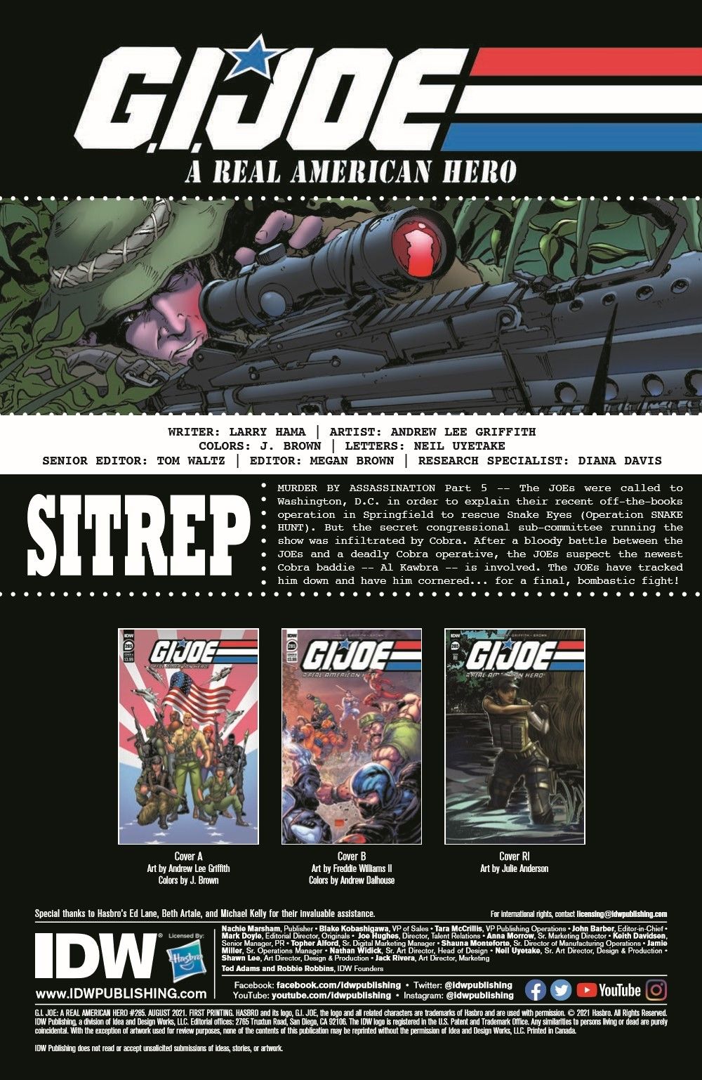 "Murder by Assassination" Part 5! EXPLOSIVE FINALE! Murder, mystery, and mayhem continue as the newest JOE continues her investigation into Cobra chaos. Can she, with the help of some special friends, solve the mystery and save the day before it's too late? The plot thickens as Living Legend Larry Hama and superstar artist Andrew Griffith (Transformers) conclude their bombastic tale featuring the exciting new JOE team member—codename: SHERLOCK!