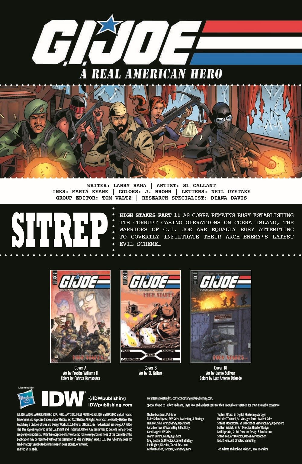 This is it, folks-the next great G.I. Joe: A Real American Hero event! As Cobra remains busy establishing its corrupt casino operations on Cobra Island, the warriors of G.I. Joe are equally busy attempting to covertly infiltrate their arch-enemy's latest evil scheme. New and classic heroes and villains will fill the pages (including some shocking appearances!) as the fan-favorite creative team of living legend Larry Hama and SL Gallant kick off the Road to Issue #300! Featuring the first of five interconnected covers (Cover A) by superstar artist Freddie Williams II!