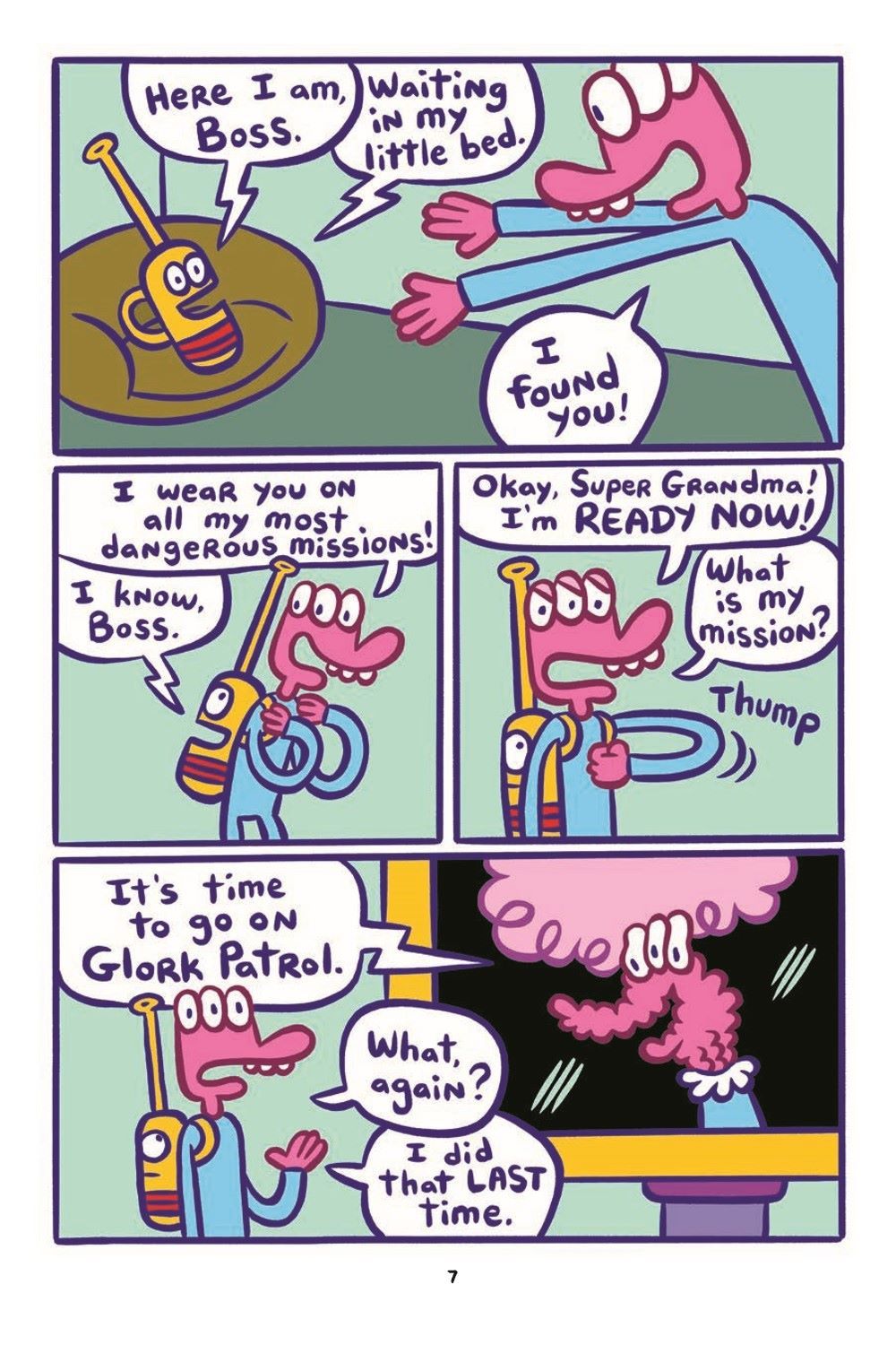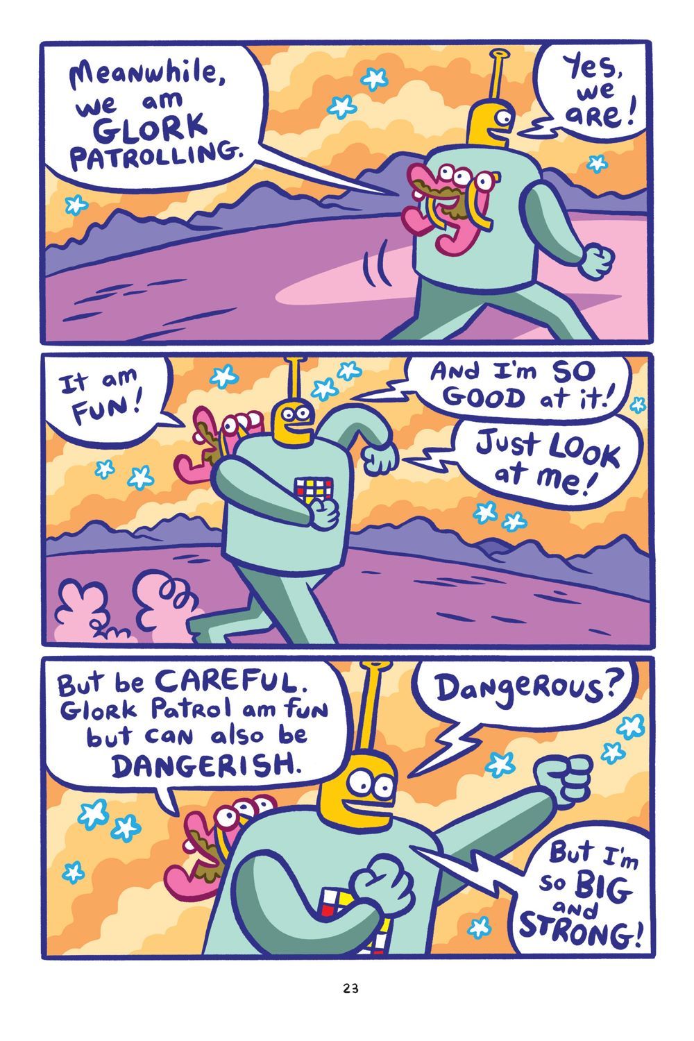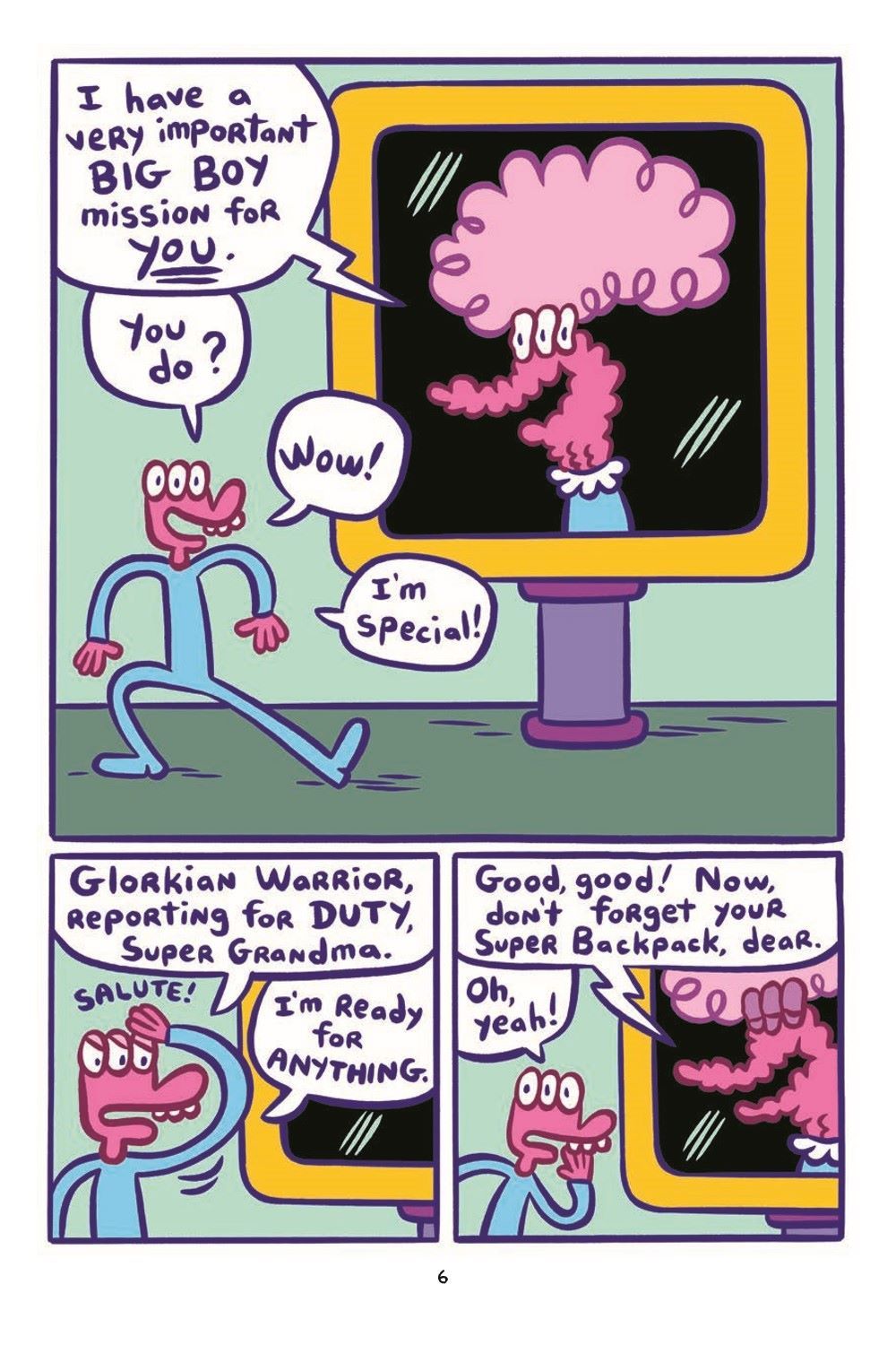 What a mess! It all started when Glorkian SuperGrandma told the Glork Patrol they could eat candy for breakfast... now their "Dada," the Glorkian Warrior, has a lot of cleaning up to do. Super Backpack gets a robot super-suit made of candy wrappers and takes Baby Gonk on the adventure of a lifetime, while Glorkian Warrior stays behind and tries to help the uncontrollable Baby Quackaboodle take a bath.