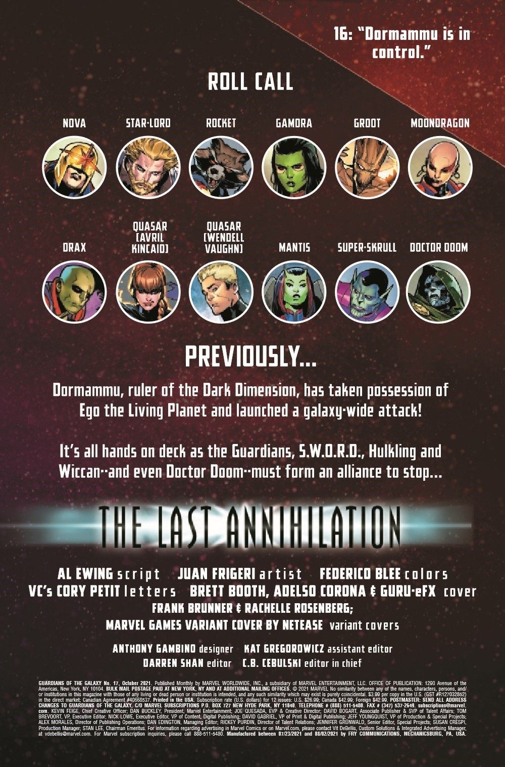 THE LAST ANNIHILATION RAGES ON! The Guardians are scattered to save five different planets - but it's already too late for Chitauri Prime. Why those five? What are the true plans of the mysterious enemy targeting our universe? Only DOCTOR DOOM knows... ...but with the entire Chitauri species out for his blood, he might not survive to stop them!