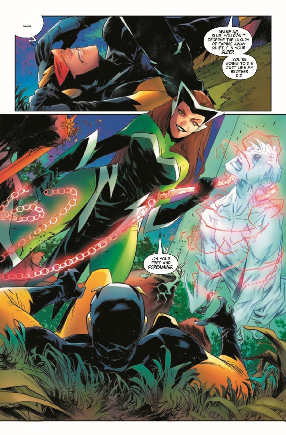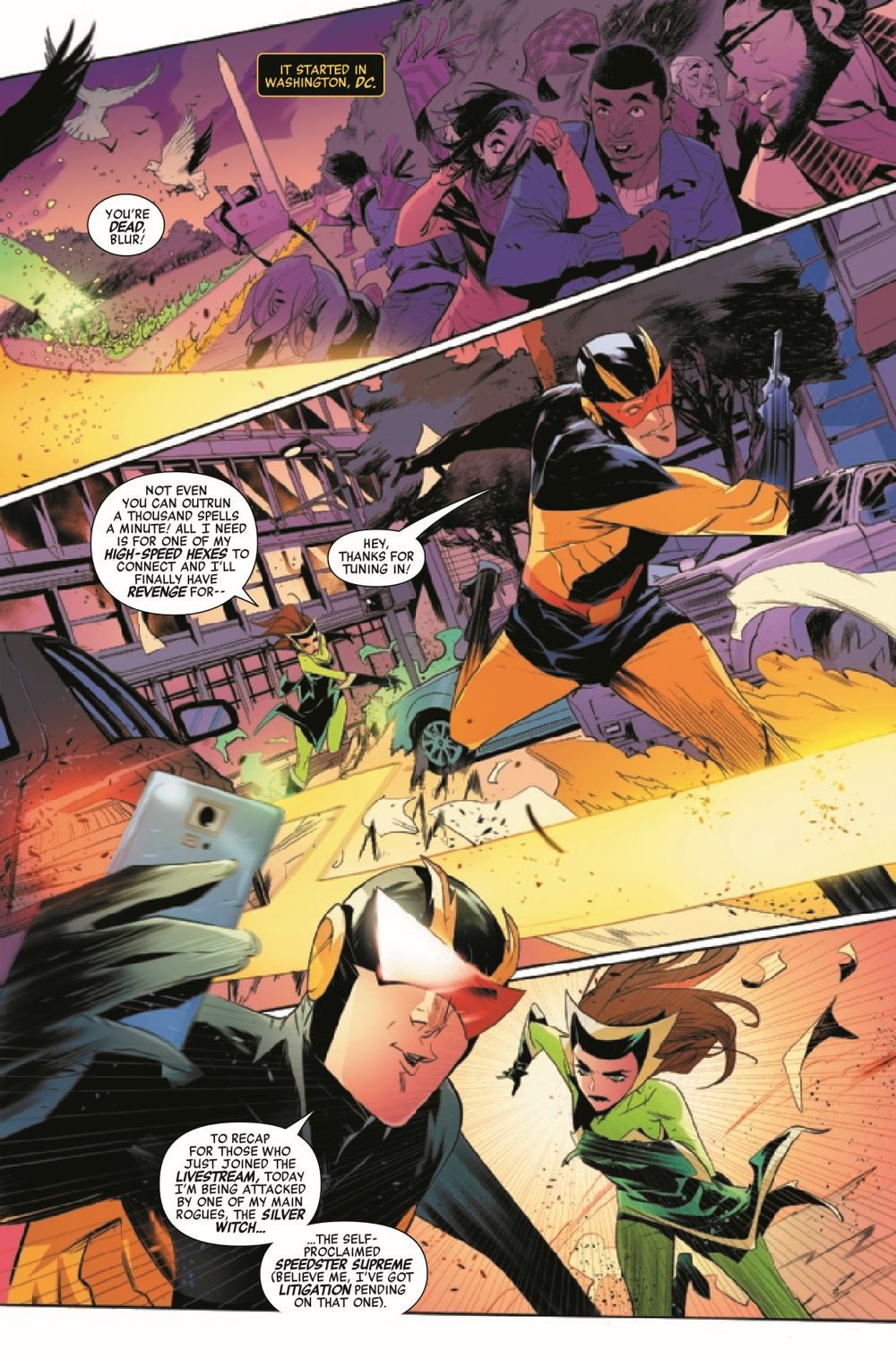 Chaos magic at Mach 5! Blur, the swiftest mortal alive, must win a race through the mind-bending Dread Dimension in order to save his soul from the hypersonic hexes of the Speedster Supreme, the Silver Witch. Plus a back-up tale takes us inside the dark secrets of the Ravencroft Asylum and its newest inmate, the Phoenix.