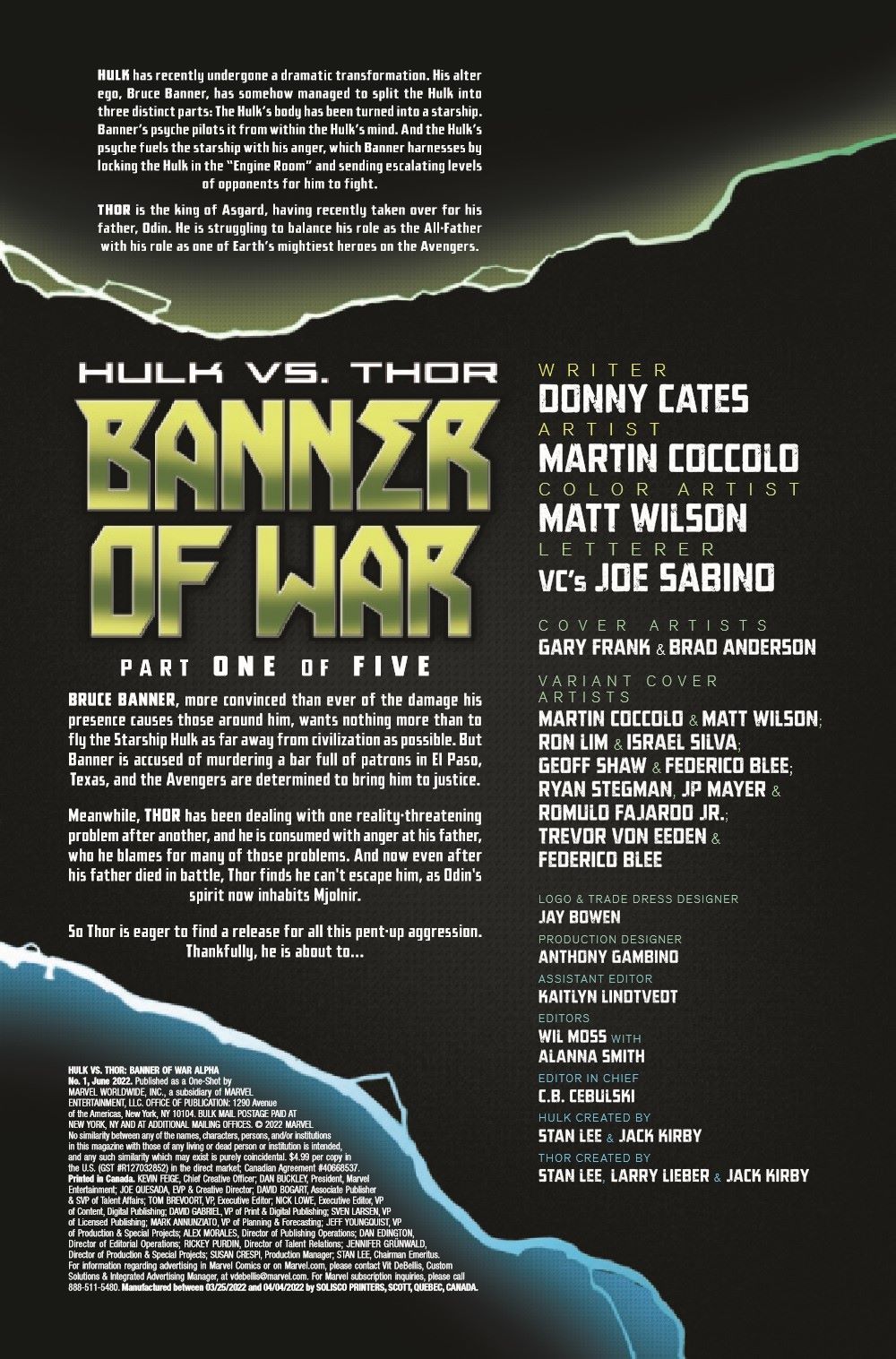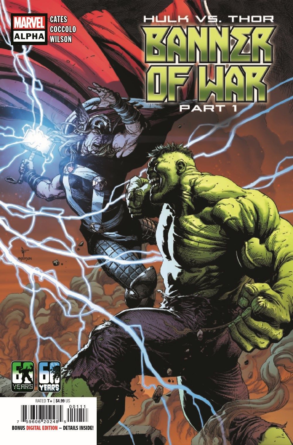 Hulk and Thor have both undergone massive changes recently, but one thing remains constant - their heated rivalry! When mysterious circumstances bring them into conflict once more, will the God of Thunder be able to triumph against a Bruce Banner who can now control his rage? Celebrating the 60th Anniversary of both characters, this epic five-part crossover between the THOR and HULK series starts here in this oversized Alpha issue, brought to you by creators Donny Cates and Martin Coccolo! Key mysteries from both series will be revealed, as well as shocking consequences for the future of both characters! (Continued in May's THOR #25 and HULK #7!)