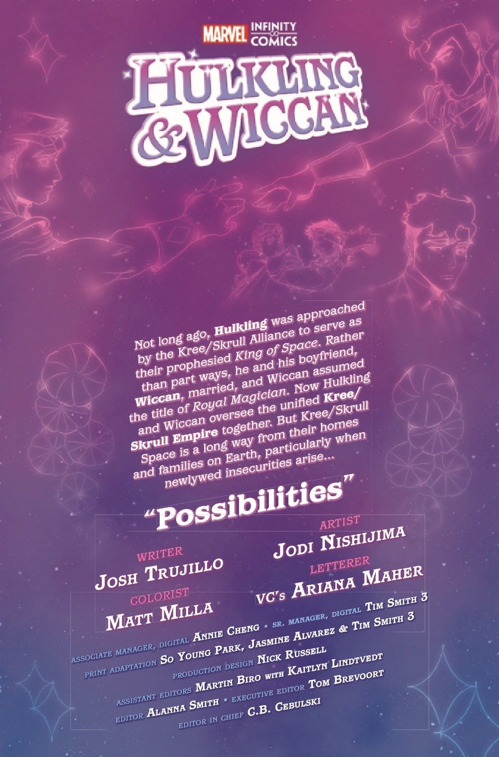 Hulking & Wiccan have found their happy ending at last…or have they? When a magical artifact shows them the paths not taken in life and love, will Billy and Teddy find their way back to each other? Will they even want to? The hit Infinity comic by Josh Trujillo (UNITED STATES OF CAPTAIN AMERICA) and Jodi Nishijima (SPIDER-GWEN: GWENVERSE) appears in print for the first time!
