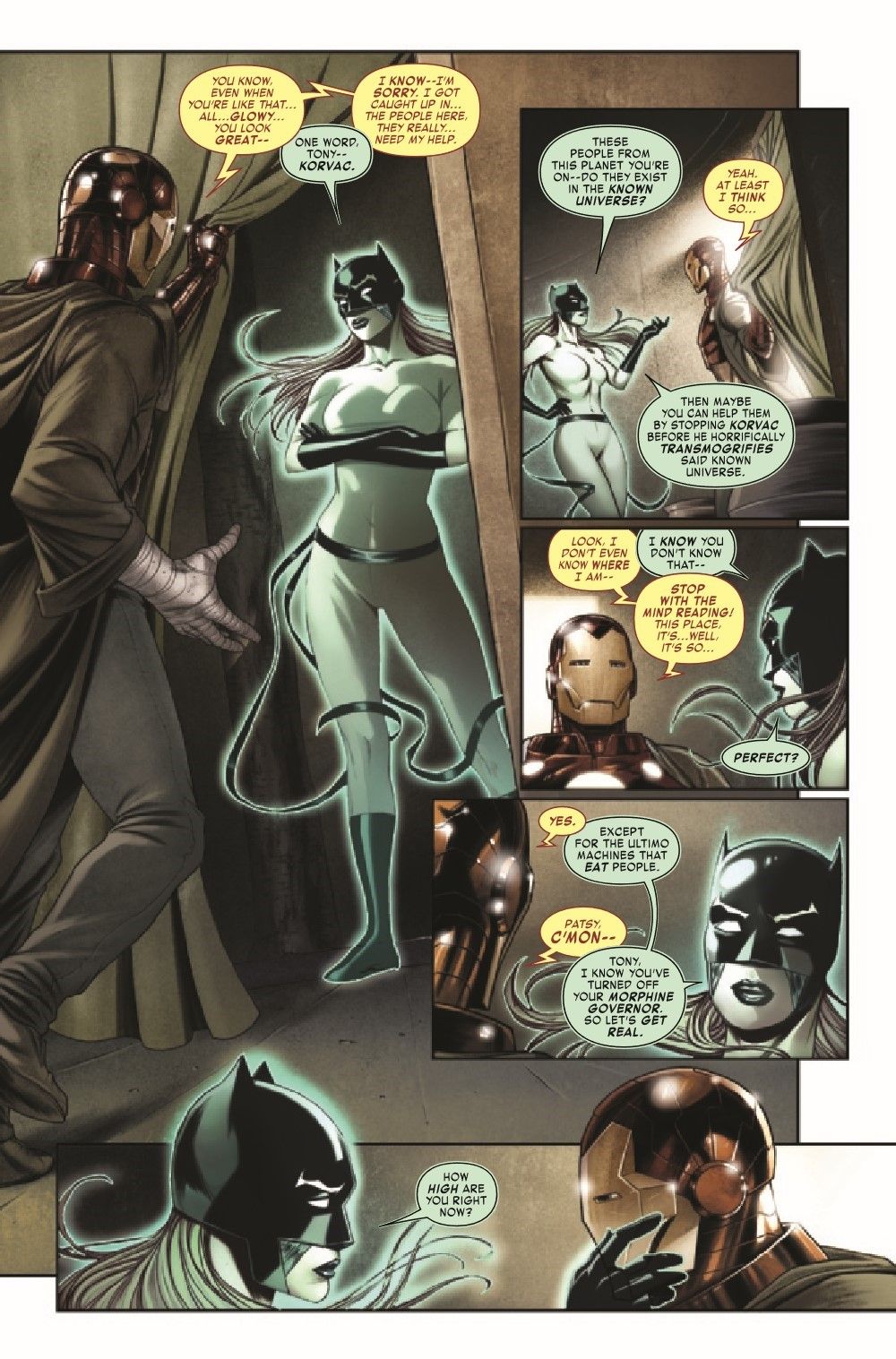 After bringing down an Ultimo robot nearly singlehandedly, Iron Man continues to investigate the strange and small colony on the remote planet where he's been marooned. Life here seems perfect...but is it? And who's possibly pulling the strings behind its delicate design? As Tony digs deeper for answers, an astral projection of Hellcat warns him that Korvac is still the biggest threat they all face...unless Tony gives into addiction, this time in the form of pain medication for his many injuries. FEATURING ANOTHER APPEARANCE BY EVERYONE'S FAVORITE ARMORED CANADIAN HERO, AVRO-X! Plus: STILT-MAN!