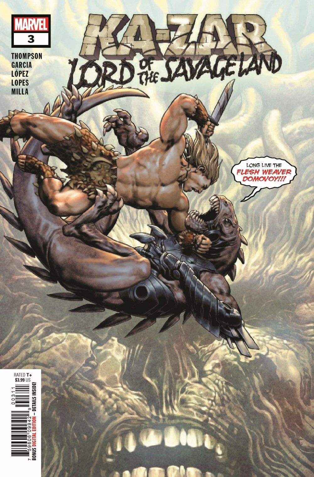 THE NEW MASTER OF THE SAVAGE LAND IS REVEALED! Matthew Plunder has betrayed his parents—and now the entire continent is headed for landfill. Welcome to Domovoy's Domain… You won't enjoy the experience. Zac Thompson and Germán García reshape a corner of the Marvel Universe in another installment of their pulse-pounding, heart-throbbing adventure through forbidden territory!