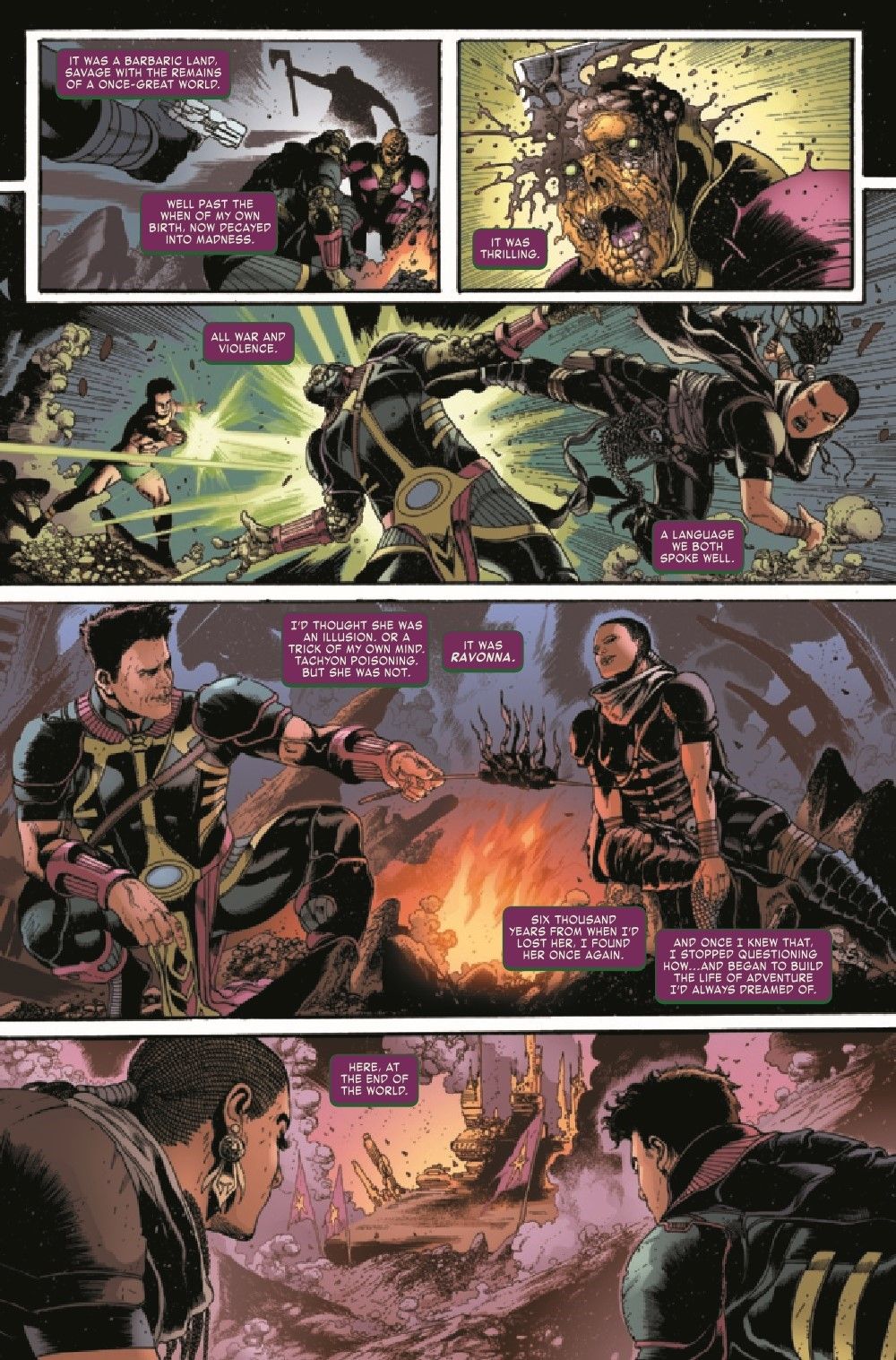 Unstoppable force meets immovable object as Nathaniel Richards' mission to change his timeline slams into a horrible inevitability: the tragic fate of Kang's great love, Ravonna Renslayer. • Can young Kang avert catastrophe and find his way to a better future? Or is he doomed to repeat the same cycle of tragedy and violence for all eternity?