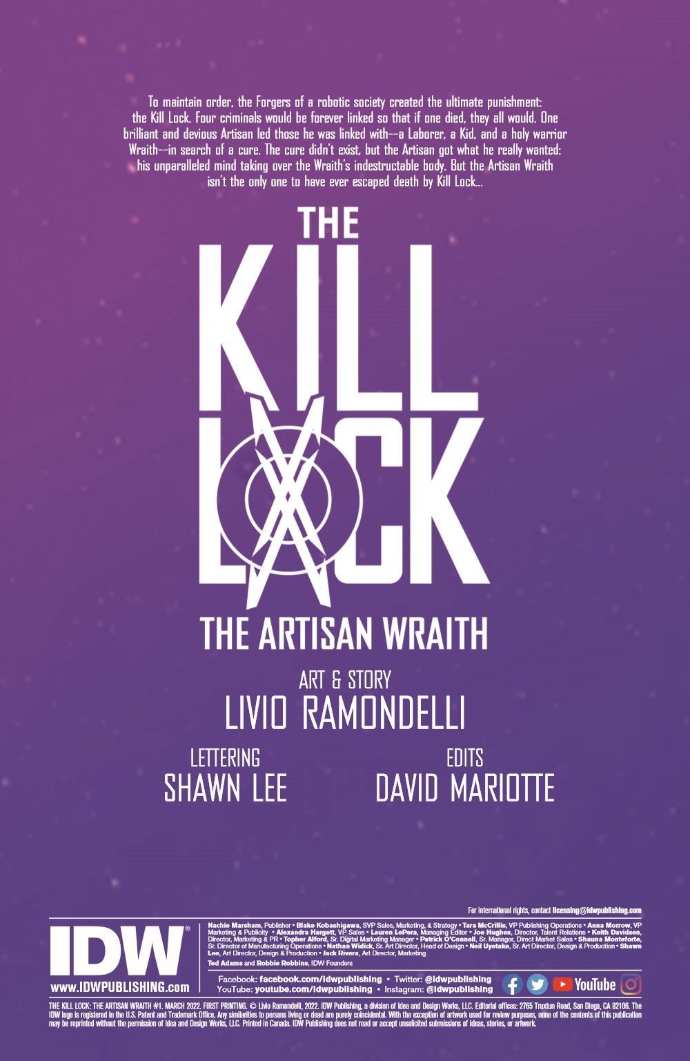 The Kill Lock unified four criminals in a quest to escape their seemingly inevitable, linked deaths. They managed to escape destruction by merging their consciousnesses, and now one of the smartest-and most malicious-bots in the universe has an unbreakable body and a planet at his command. Homeworld won't allow it, and so two of the deadliest assassins in the universe are tasked to kill the Artisan Wraith. Transformers artist Livio Ramondelli continues the cult hit, The Kill Lock (2020) in the next installment of this vicious and darkly funny sci-fi series.