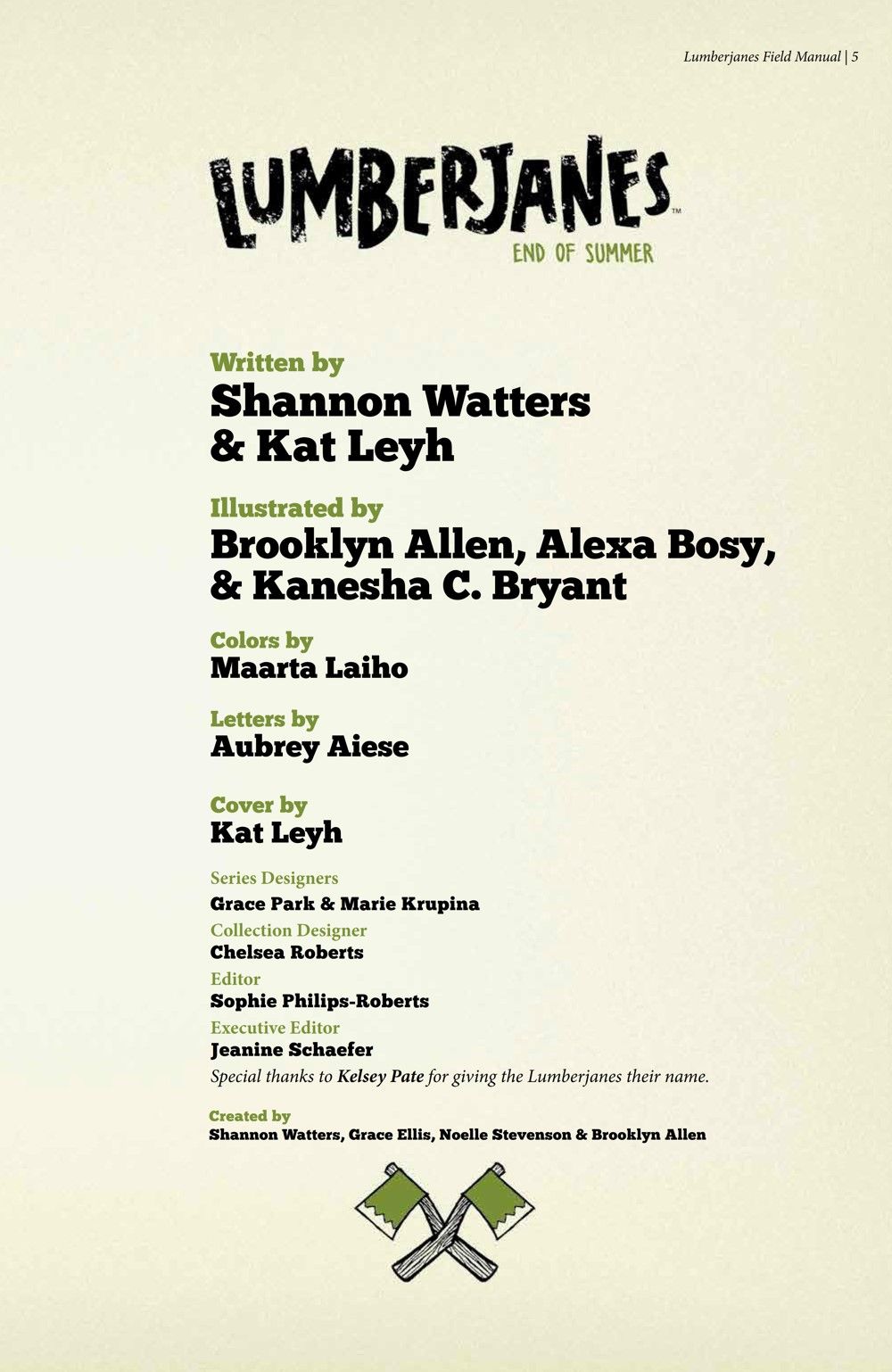The end of summer is here and what is a girl (or girls) to do? The final volume of the GLAAD and Eisner Award-winning series follows Jo, Mal, Molly, April, and Ripley as they attempt to defend Miss Qiunzella Thiskwin Penniquiqul Thistle Crumpet's Camp for Hardcore Lady Types from the mysterious force known as the Grey. Even if they succeed, they will have to deal with their biggest challenge yet, saying goodbye as summer finally comes to an end. The team of Kat Leyh, Shannon Watters, Alexa Bosy, Kanesha C. Bryant, and returning series co-creator Brooklyn Allen conclude one of the most important and acclaimed comics of the century by taking Friendship To The Max one last time. Collects Lumberjanes #75, Lumberjanes: End of Summer #1, and the Lumberjanes: Farewell to Summer FCBD Special.