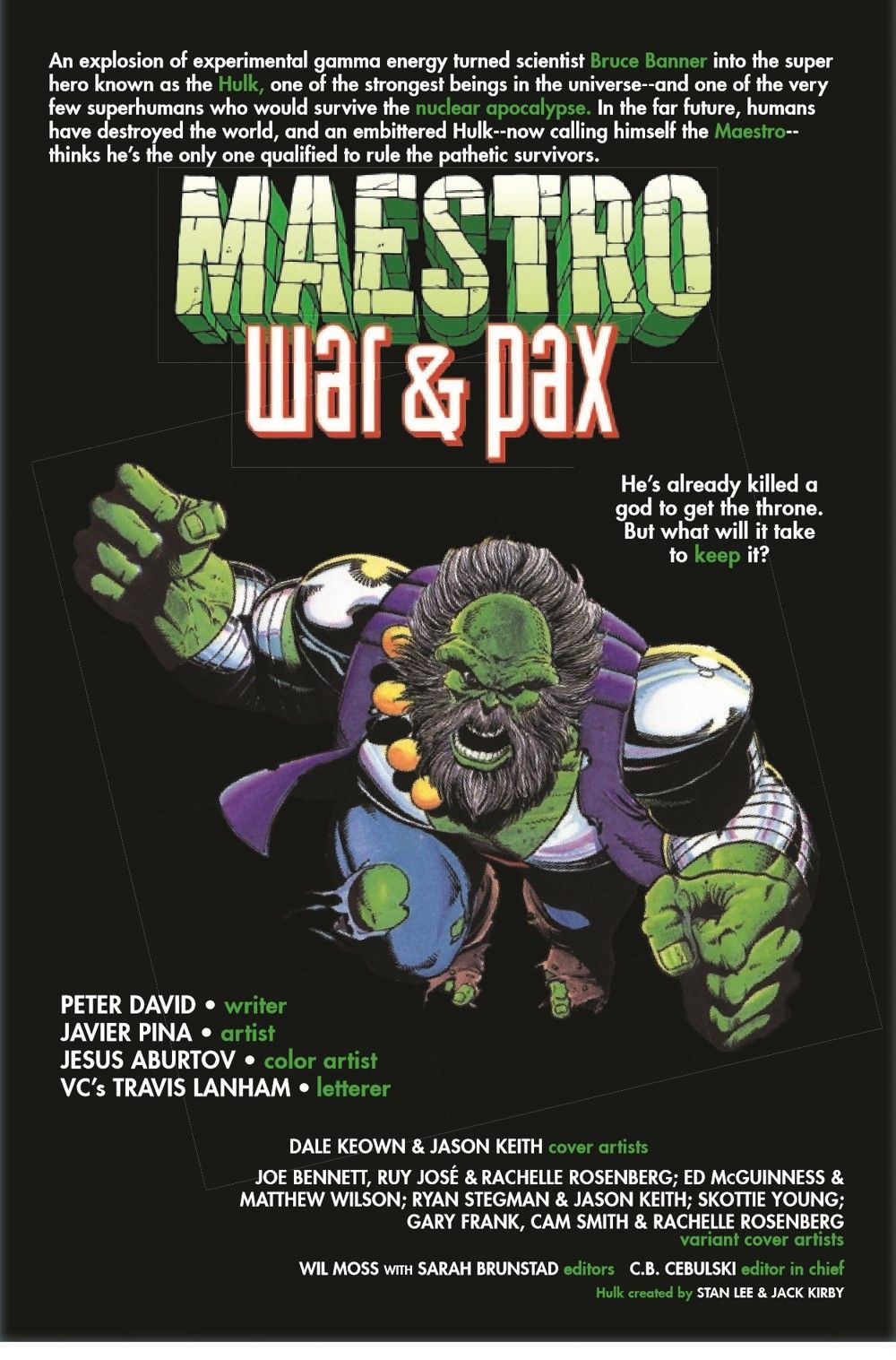PETER DAVID AND THE MAESTRO RETURN IN A BRAND-NEW SERIES! The man once known as the Hulk is now neither man, nor Hulk - call him only THE MAESTRO! After deposing Dystopia's ancient ruler, the Maestro sets his sights even bigger. It's time the entire planet Earth recognized their one true god! But the Maestro isn't the only immortal left...and if he wants to truly dominate the planet, he'll have to face the most powerful beings in creation! PETER DAVID continues the tale that began decades ago in the legendary Future Imperfect!